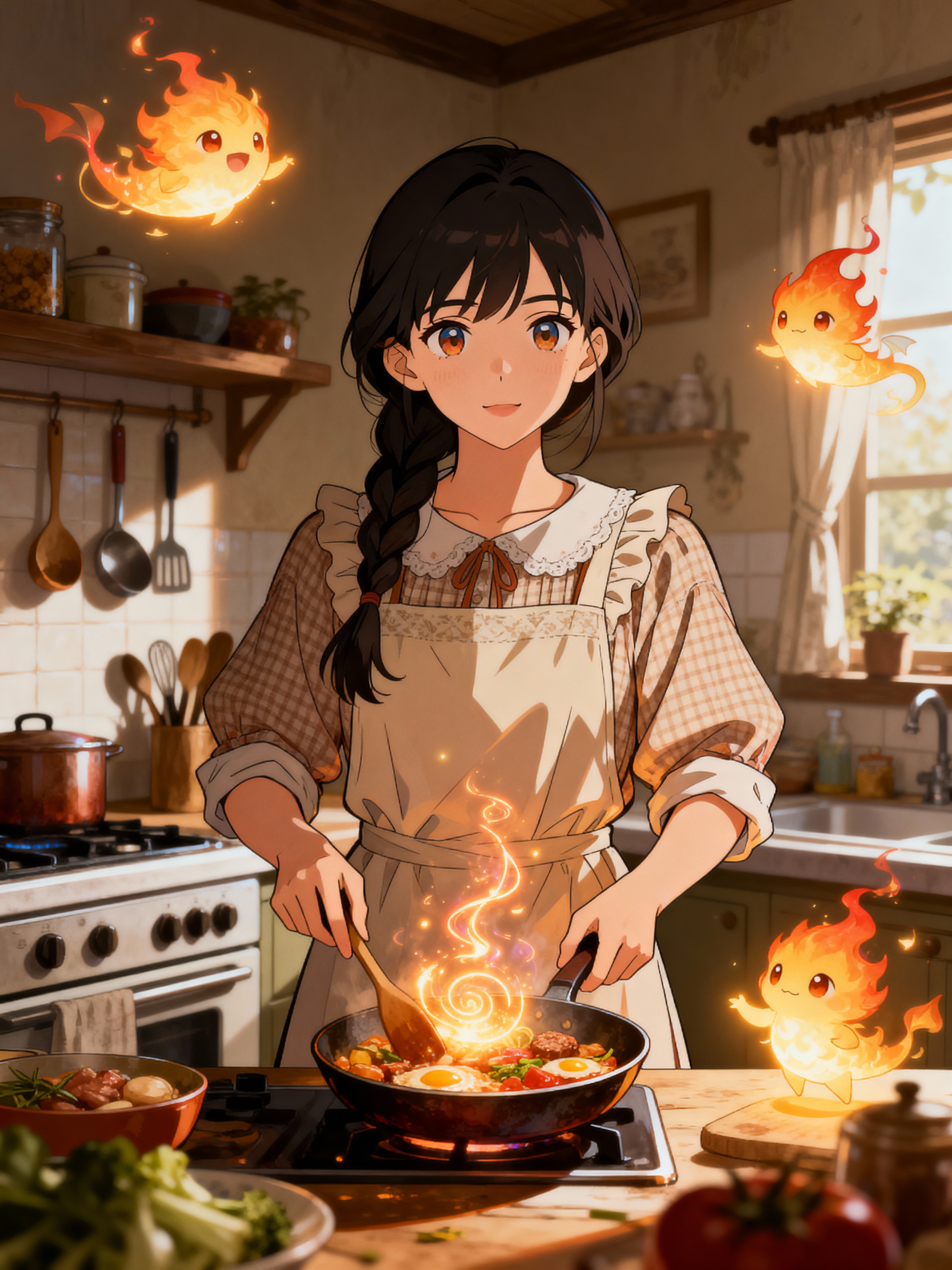A heartwarming line art anime portrait in a cozy kitchen, with model wearing a homey dress with an apron , cooking magical food that glows and floats. The kitchen is filled with animated cooking tools and helpful spirits. The style is warm.