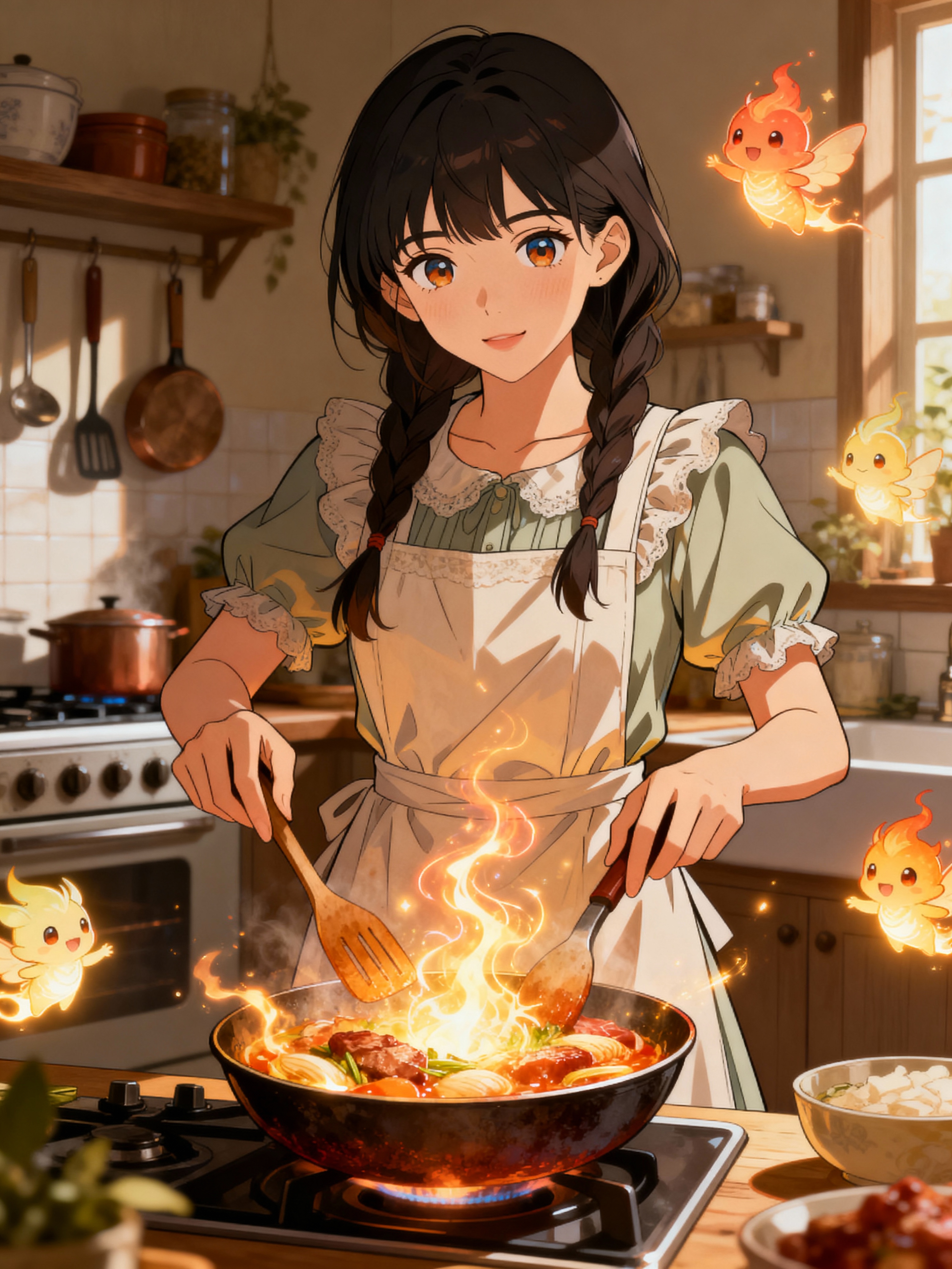 A heartwarming line art anime portrait in a cozy kitchen, with model wearing a homey dress with an apron , cooking magical food that glows and floats. The kitchen is filled with animated cooking tools and helpful spirits. The style is warm.