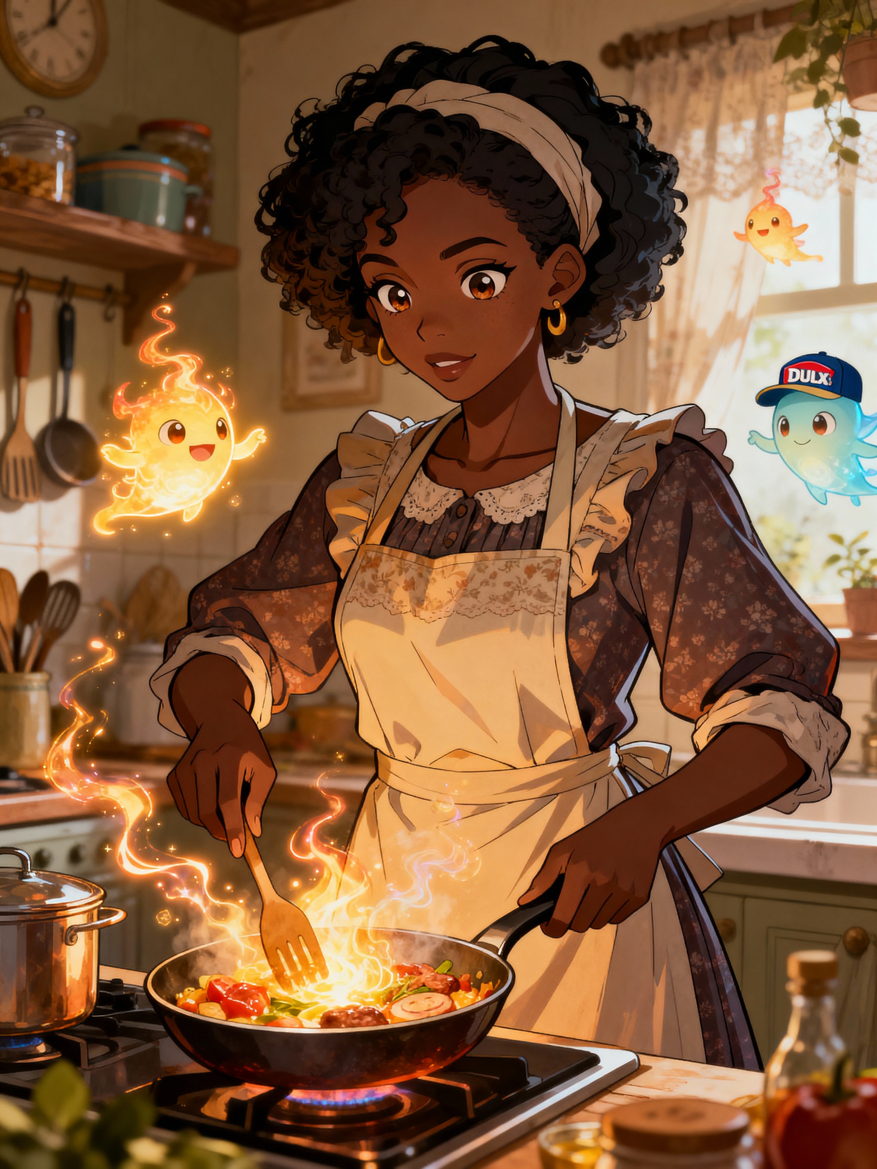 A heartwarming line art anime portrait in a cozy kitchen, with model wearing a homey dress with an apron , cooking magical food that glows and floats. The kitchen is filled with animated cooking tools and helpful spirits. The style is warm.