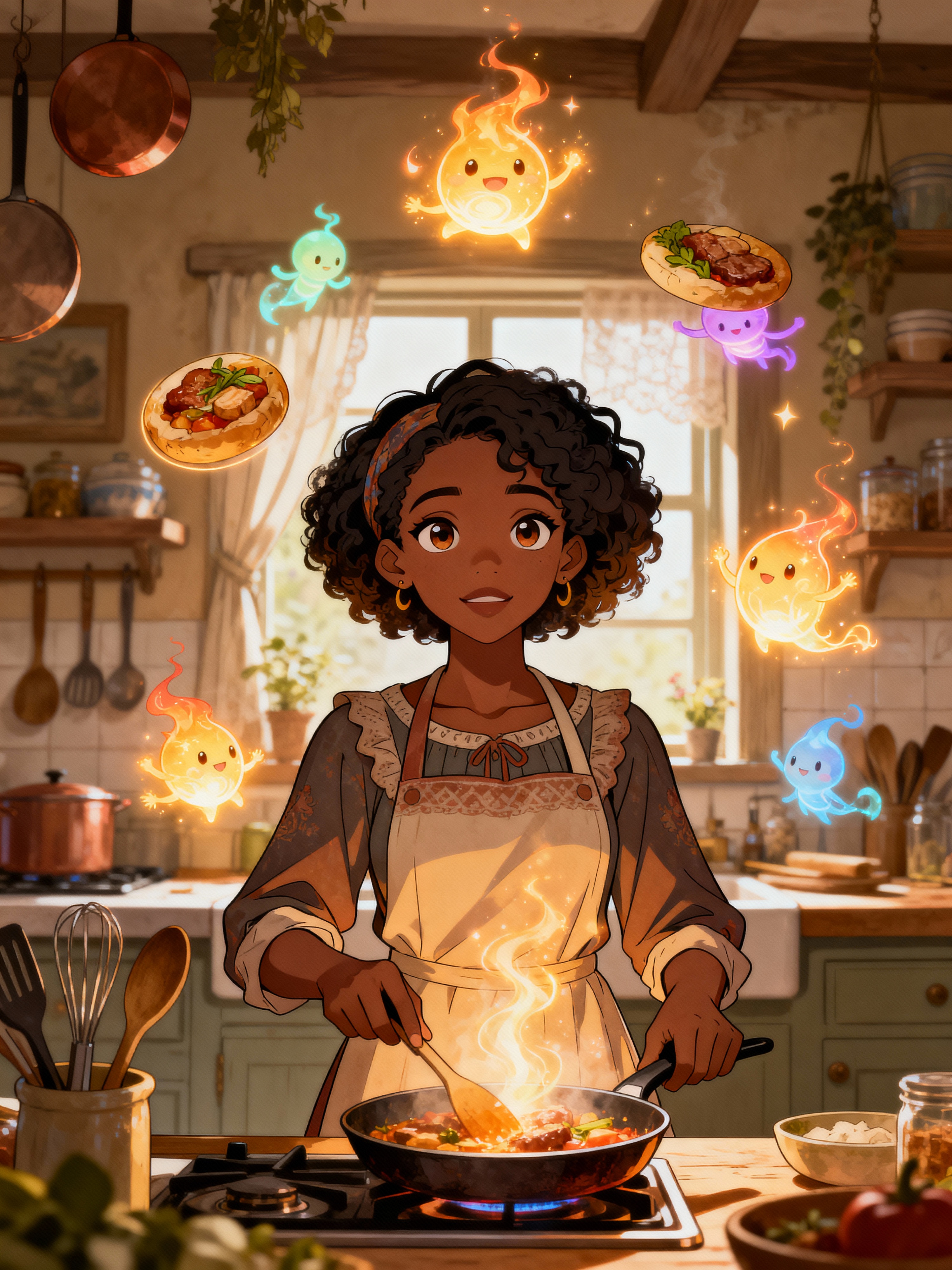 A heartwarming line art anime portrait in a cozy kitchen, with model wearing a homey dress with an apron , cooking magical food that glows and floats. The kitchen is filled with animated cooking tools and helpful spirits. The style is warm.