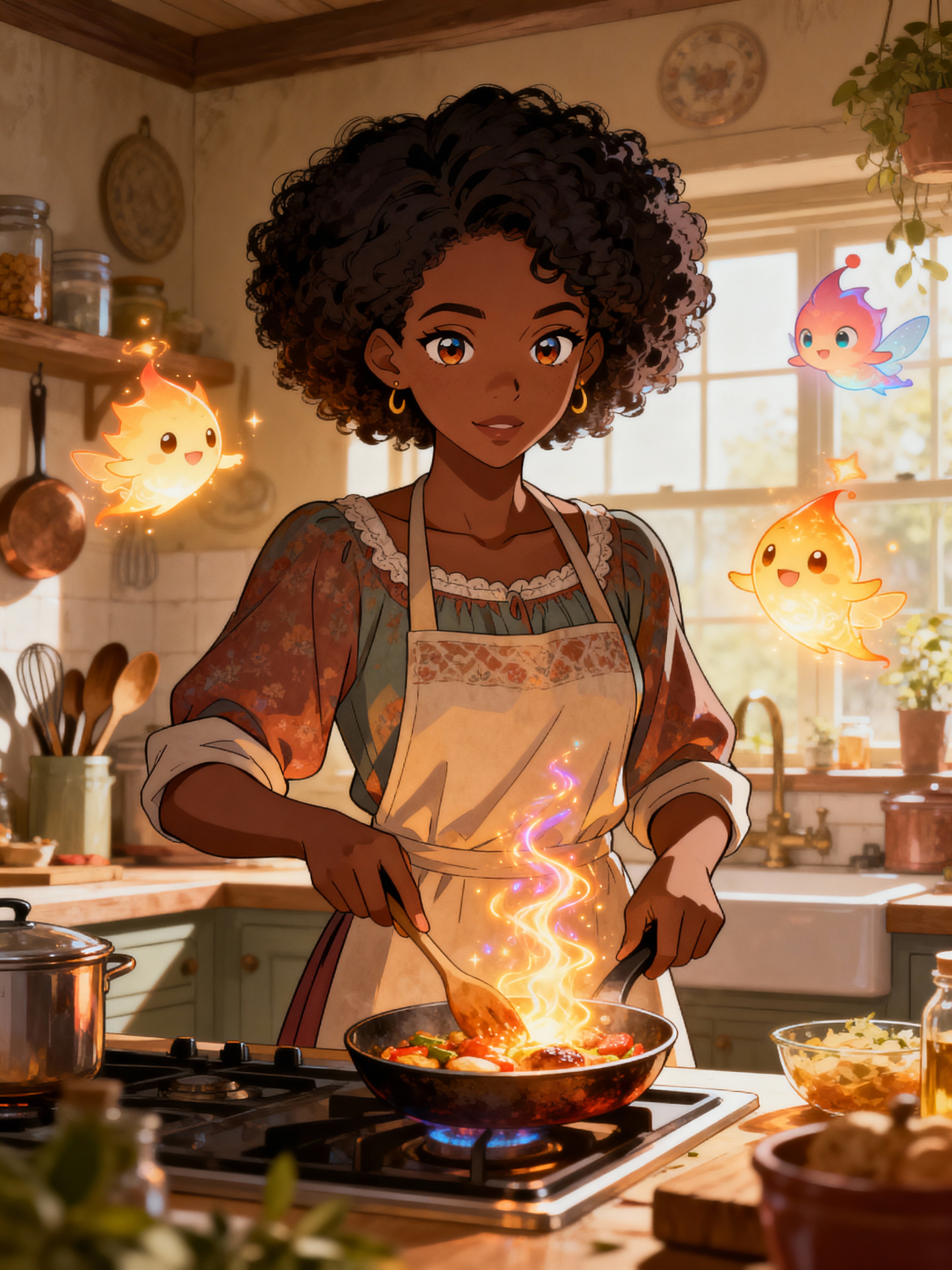 A heartwarming line art anime portrait in a cozy kitchen, with model wearing a homey dress with an apron , cooking magical food that glows and floats. The kitchen is filled with animated cooking tools and helpful spirits. The style is warm.
