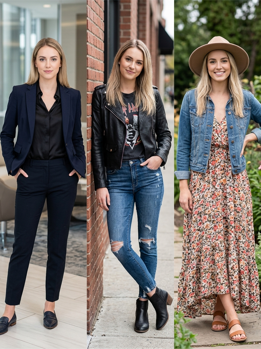 A high-quality 3-panel vertical split image showing one young model in three different fashion styles and poses to create a versatile 'impressive' look.