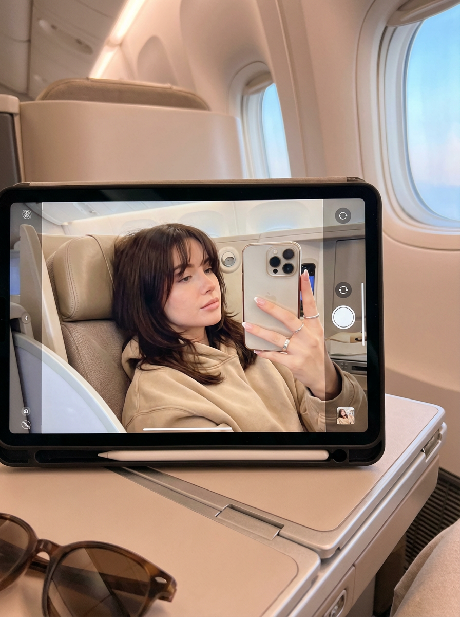 A highly realistic, tightly framed scene showing the reflection of a fair-skinned model with flawless skin on an iPad placed on the airplane's foldable tray table in front of the subject, with a pair of sunglasses positioned in the foreground as an aesthetic element. Beige/grey cabin seats fill the area surrounding the iPad. On the iPad screen, the subject appears half-reclining on the airplane seat. Her left hand supports her head, fingers gently touching her temple in a relaxed gesture. Her right hand holds an iPhone 16 Pro Max to take the picture, with part of her face visible on the tablet screen. Her expression is soft, eyes slightly looking downward, giving a dreamy and calm feeling. She is wearing an oversized beige hoodie made of thick, soft fabric, with the hoodie pulled over her head. Minimalist silver rings. French nail art. Her hair is long, straight with layered cuts and beautiful volume, parted in the middle with soft front bangs covering her forehead and framing her face, in dark brown with subtle highlights. Her skin is bright, fair, and flawless with soft Korean glam makeup. Pink blush on her cheeks. Glossy rosy pink lips. Thin eyeliner and curled lashes. The environment visible behind the reflection is minimalistic yet lively: a premium/business class airplane cabin interior. A large airplane window shows soft blue light from the sky outside. The iPad camera UI—shutter button, small icons, and dock—are clearly visible on the screen. Soft-warm × pastel aesthetic tone. Edited in a “K-aesthetic soft glow” style. 9:16 portrait aspect ratio, HD, high quality. **Do NOT change the face.