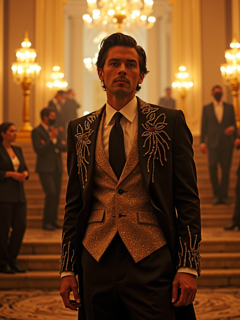 A Hollywood celebrity attending an exclusive Met Gala event, posing dramatically in a bold designer suit with unique artistic elements. The background showcases luxurious golden lighting and a grand entrance staircase filled with other elite guests.