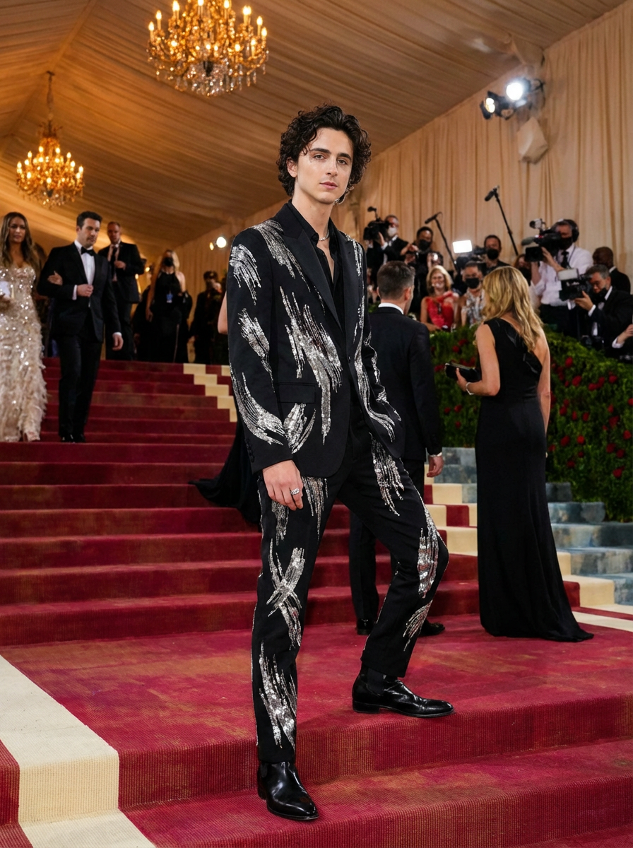 A Hollywood celebrity attending an exclusive Met Gala event, posing dramatically in a bold designer suit with unique artistic elements. The background showcases luxurious golden lighting and a grand entrance staircase filled with other elite guests.