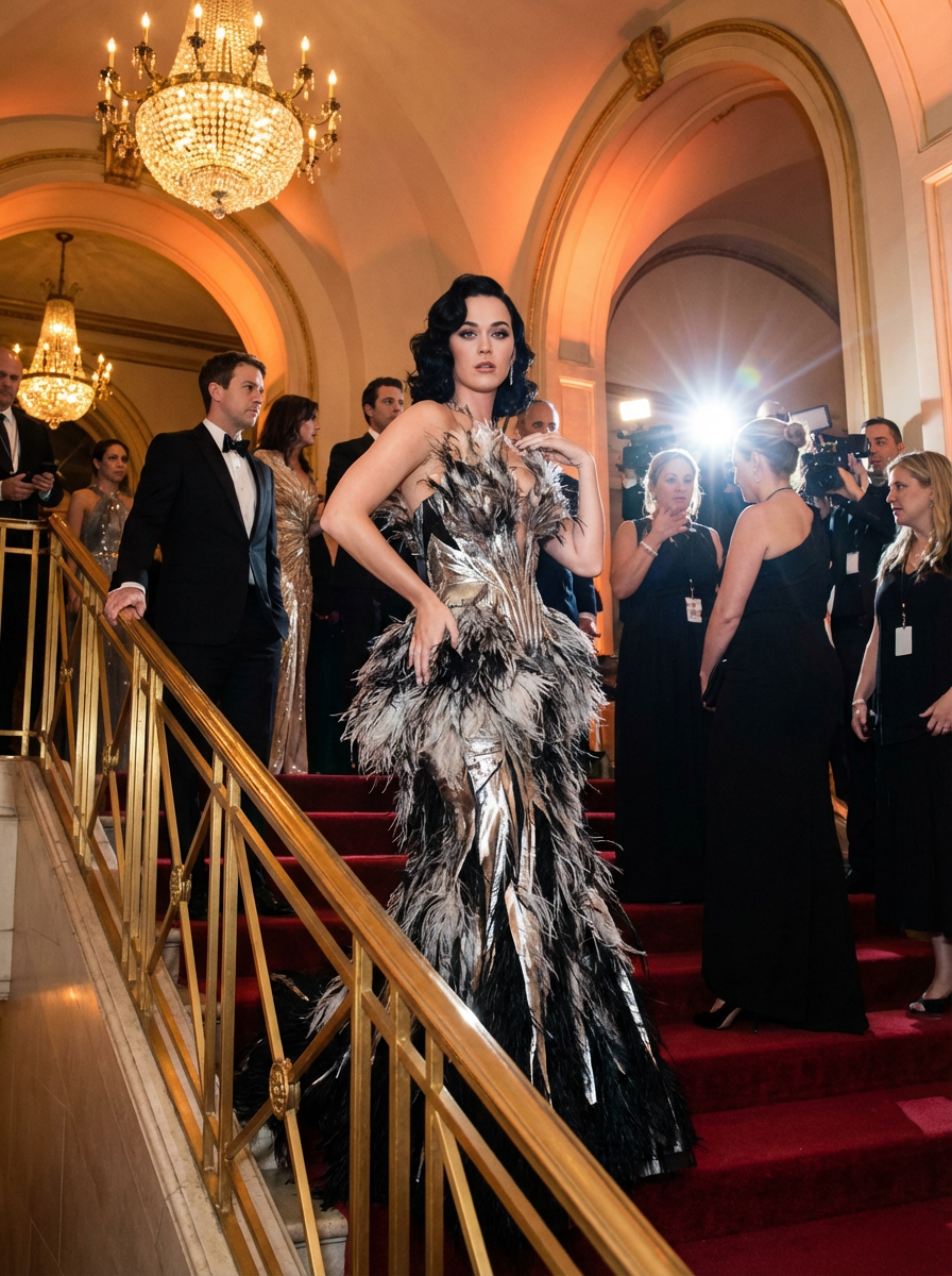 A Hollywood celebrity attending an exclusive Met Gala event, posing dramatically in a high-fashion avant-garde gown with extravagant detailing . The background showcases luxurious golden lighting and a grand entrance staircase filled with other elite guests.