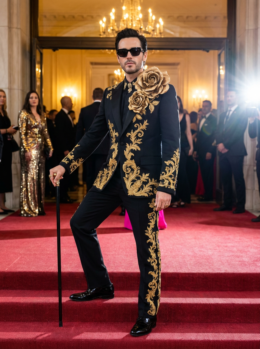 A Hollywood celebrity attending an exclusive Met Gala event, posing dramatically in a bold designer suit with unique artistic elements. The background showcases luxurious golden lighting and a grand entrance staircase filled with other elite guests.