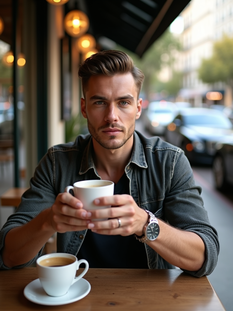 A Hollywood star caught in a candid paparazzi moment while having coffee at an upscale café. The model is dressed in a relaxed yet stylish look with a high-end watch and sleek haircut. The setting is a charming outdoor café with luxury cars parked nearby.