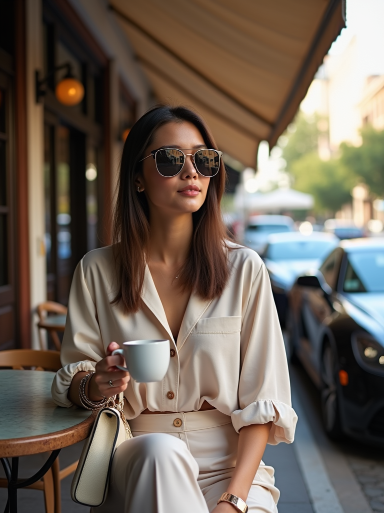 A Hollywood star caught in a candid paparazzi moment while having coffee at an upscale café. The model is dressed in a casual designer ensemble with oversized sunglasses and luxury handbag . The setting is a charming outdoor café with luxury cars parked nearby.