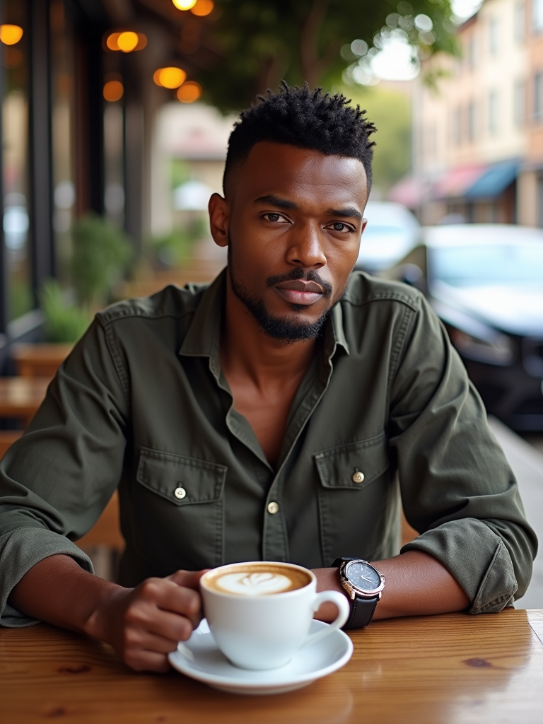 A Hollywood star caught in a candid paparazzi moment while having coffee at an upscale café. The model is dressed in a relaxed yet stylish look with a high-end watch and sleek haircut. The setting is a charming outdoor café with luxury cars parked nearby.