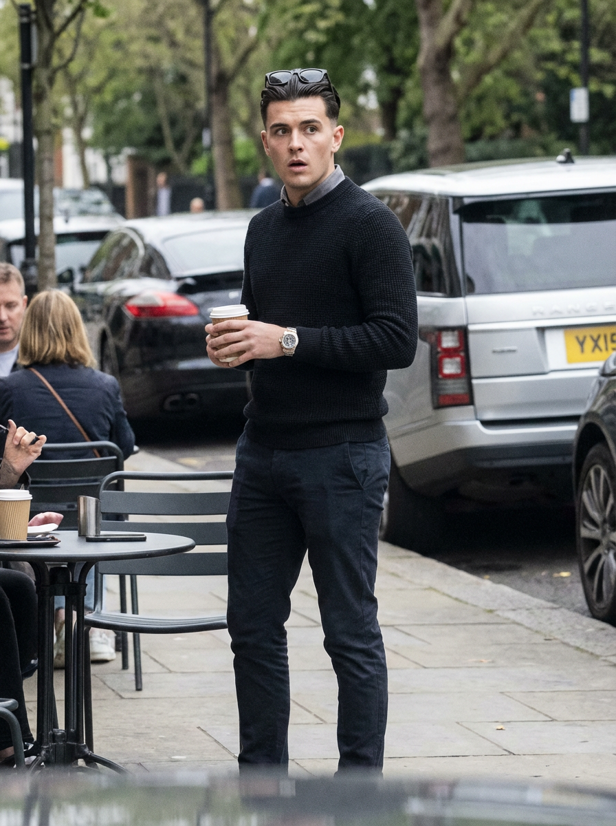 A Hollywood star caught in a candid paparazzi moment while having coffee at an upscale café. The model is dressed in a relaxed yet stylish look with a high-end watch and sleek haircut. The setting is a charming outdoor café with luxury cars parked nearby.
