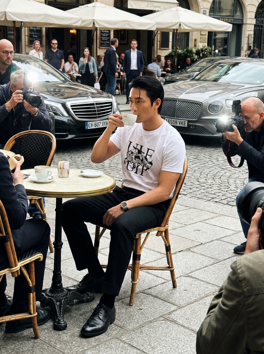 A Hollywood star caught in a candid paparazzi moment while having coffee at an upscale café. The model is dressed in a relaxed yet stylish look with a high-end watch and sleek haircut. The setting is a charming outdoor café with luxury cars parked nearby.
