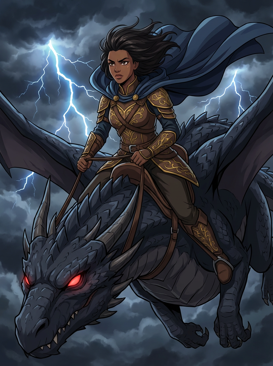 A legendary anime dragon rider soaring through stormy skies, gripping reins of a massive dragon. The model wears a regal warrior princess outfit with golden embroidery and wind-swept hair . Lightning cracks in the distance, highlighting the powerful moment. The style is in anime illustration.