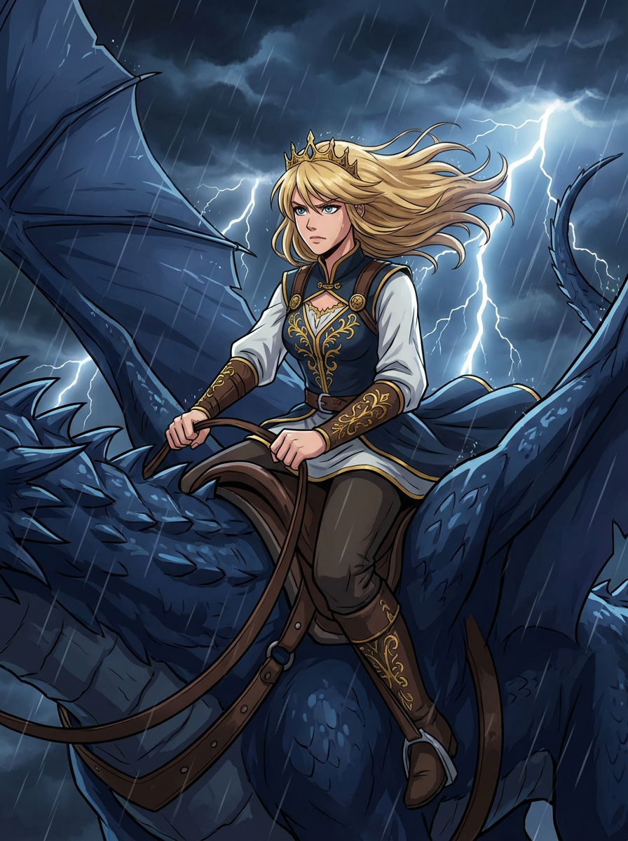 A legendary anime dragon rider soaring through stormy skies, gripping reins of a massive dragon. The model wears a regal warrior princess outfit with golden embroidery and wind-swept hair . Lightning cracks in the distance, highlighting the powerful moment. The style is in anime illustration.