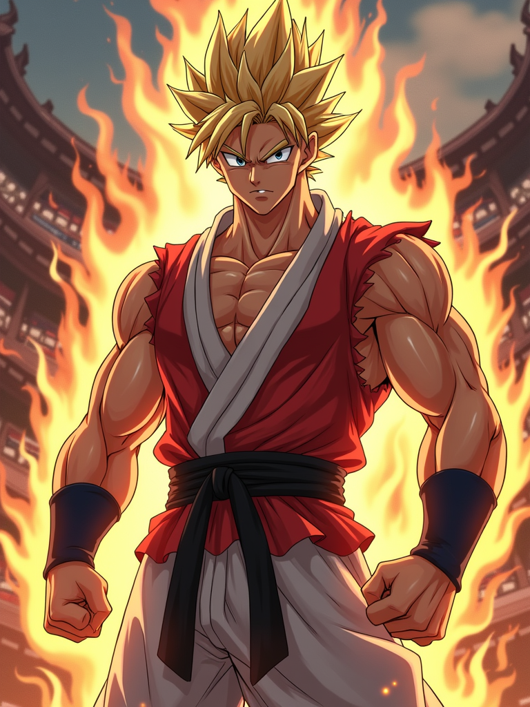 A legendary anime martial artist, posing confidently with a glowing energy aura, wearing a sleeveless martial arts outfit with muscular definition and intense expression. The background features a classic anime battle stage.