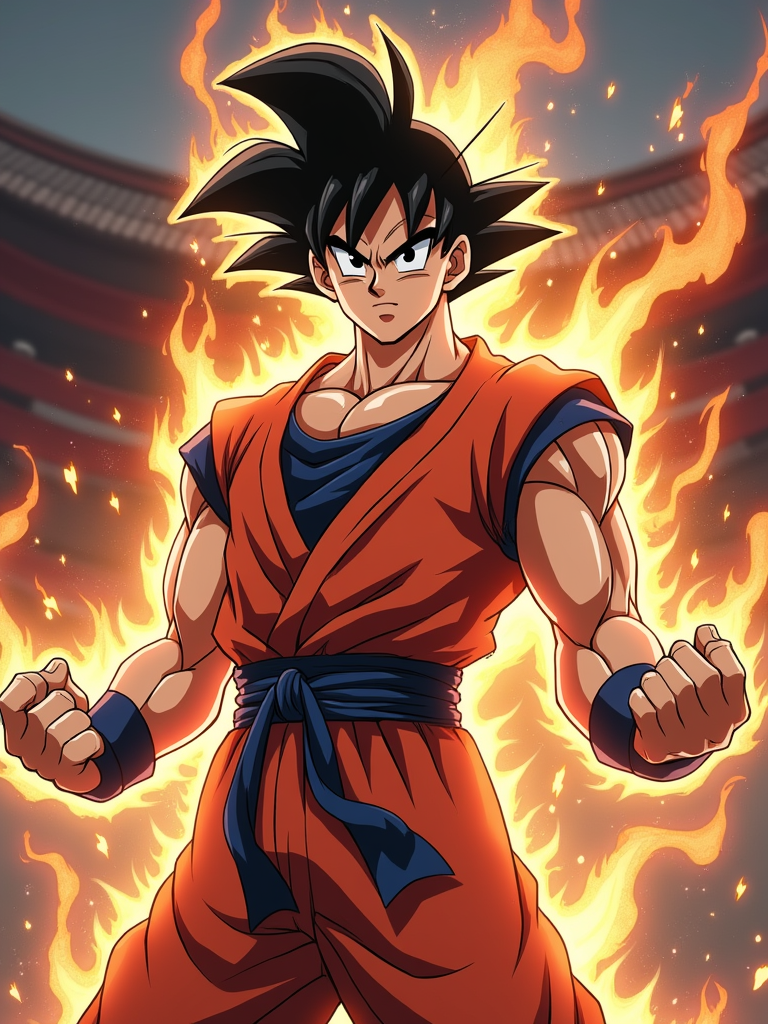 A legendary anime martial artist, posing confidently with a glowing energy aura, wearing a sleeveless martial arts outfit with muscular definition and intense expression. The background features a classic anime battle stage. the style is in anime illustration.
