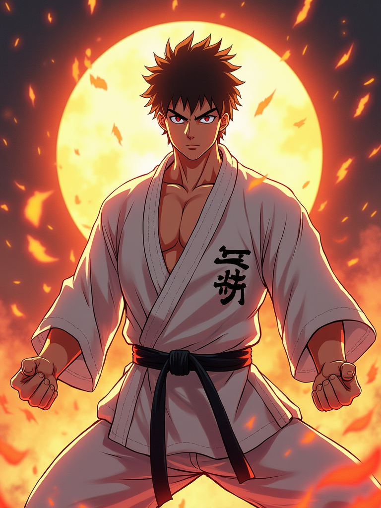 A legendary anime martial artist, posing confidently with a glowing energy aura, wearing a traditional gi with a belt and focused eyes . The background features a classic anime battle stage. the style is in anime illustration.