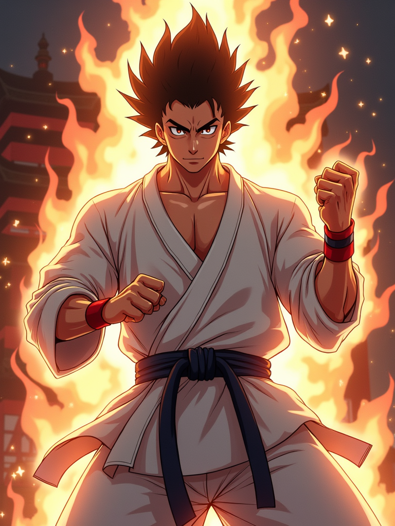A legendary anime martial artist, posing confidently with a glowing energy aura, wearing a traditional gi with a belt and focused eyes . The background features a classic anime battle stage. the style is in anime illustration.