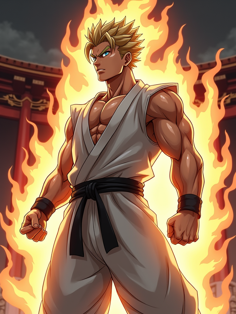 A legendary anime martial artist, posing confidently with a glowing energy aura, wearing a sleeveless martial arts outfit with muscular definition and intense expression. The background features a classic anime battle stage. the style is in anime illustration.