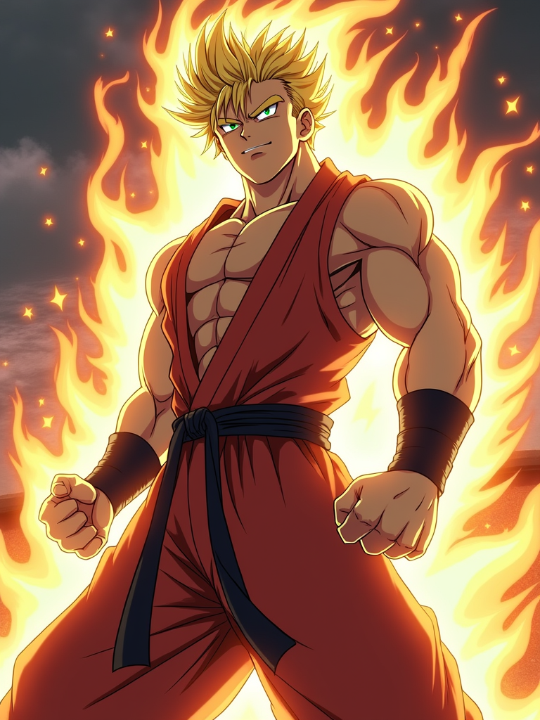 A legendary anime martial artist, posing confidently with a glowing energy aura, wearing a sleeveless martial arts outfit with muscular definition and intense expression. The background features a classic anime battle stage. the style is in anime illustration.