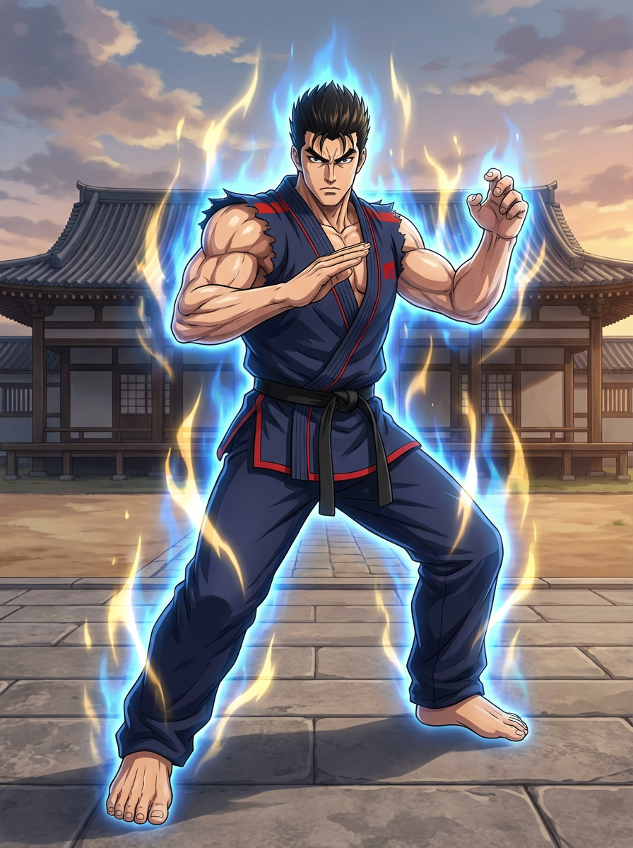 A legendary anime martial artist, posing confidently with a glowing energy aura, wearing a sleeveless martial arts outfit with muscular definition and intense expression. The background features a classic anime battle stage. the style is in anime illustration.