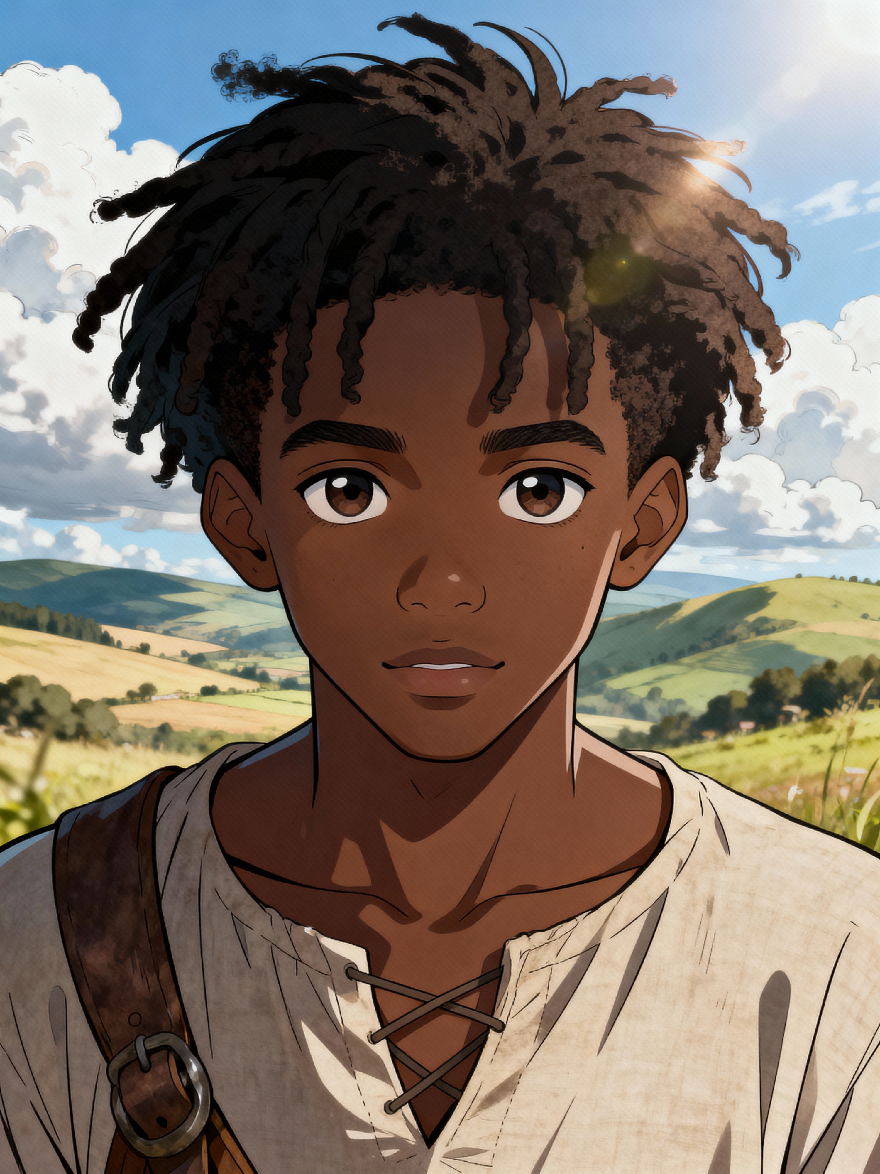 A line art anime portrait of model as a young adventurer, wearing a simple but charming outfit with messy hair and kind eyes. The background shows a peaceful countryside with rolling hills and fluffy clouds. The style is soft and whimsical.
