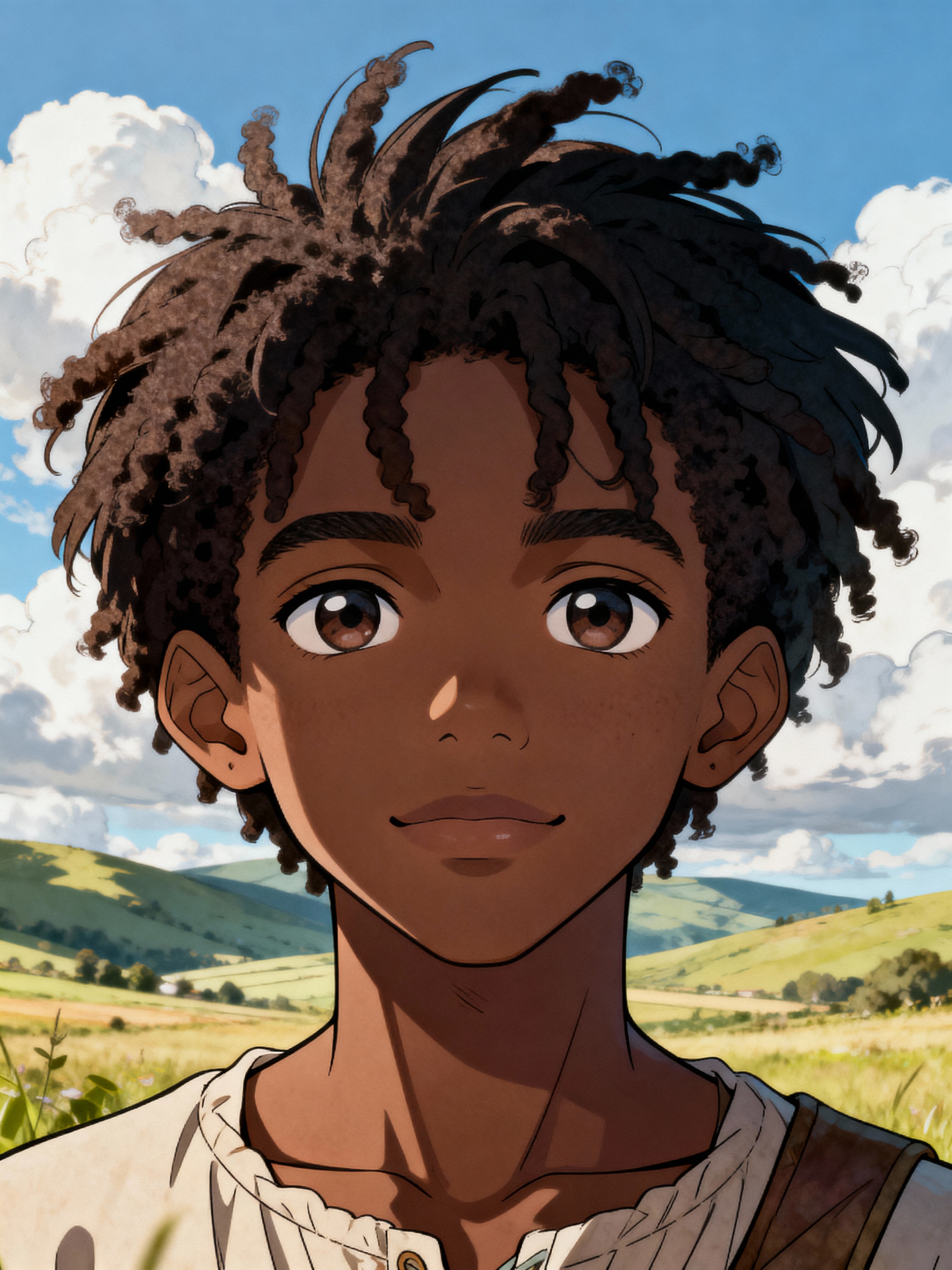 A line art anime portrait of model as a young adventurer, wearing a simple but charming outfit with messy hair and kind eyes. The background shows a peaceful countryside with rolling hills and fluffy clouds. The style is soft and whimsical.