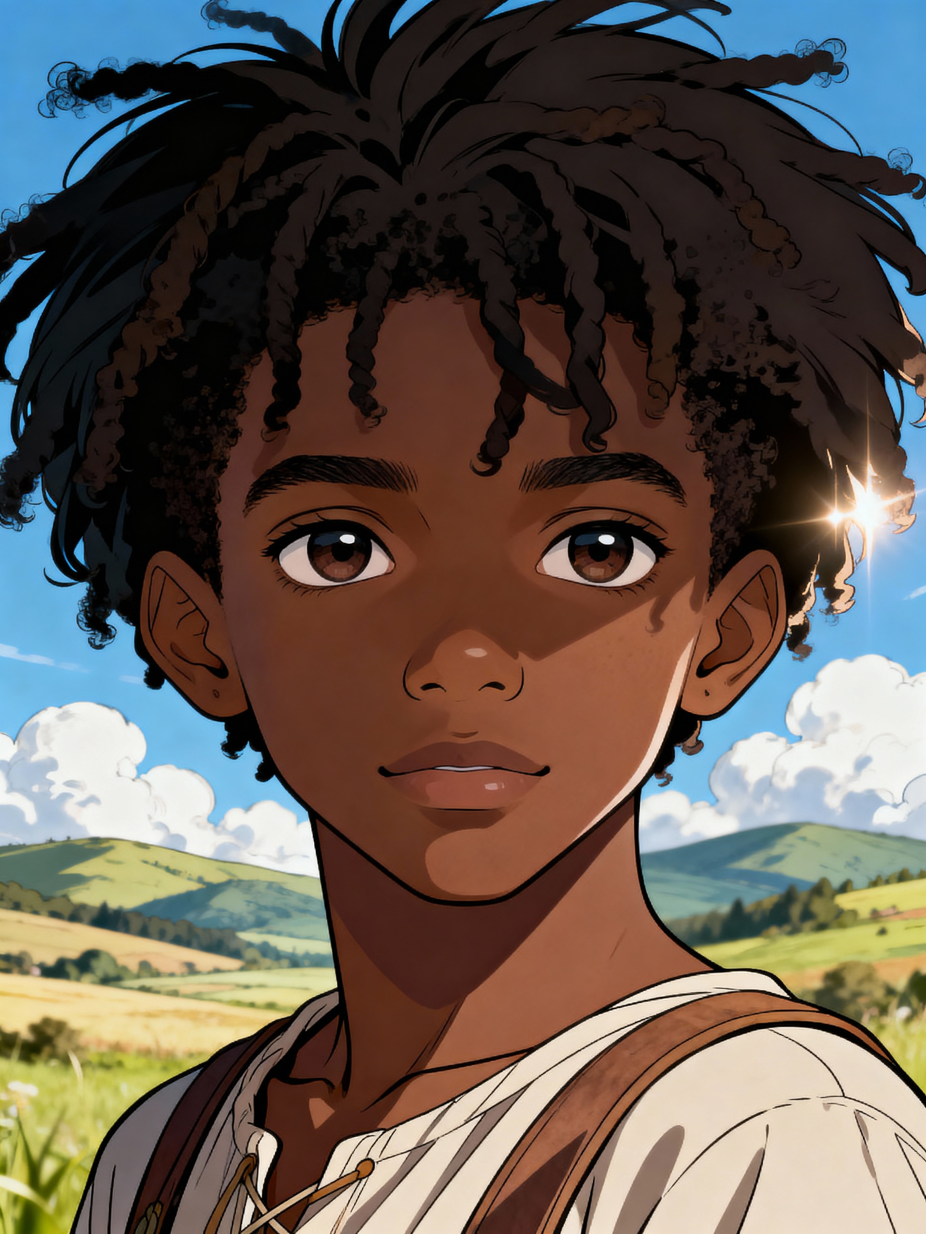 A line art anime portrait of model as a young adventurer, wearing a simple but charming outfit with messy hair and kind eyes. The background shows a peaceful countryside with rolling hills and fluffy clouds. The style is soft and whimsical.