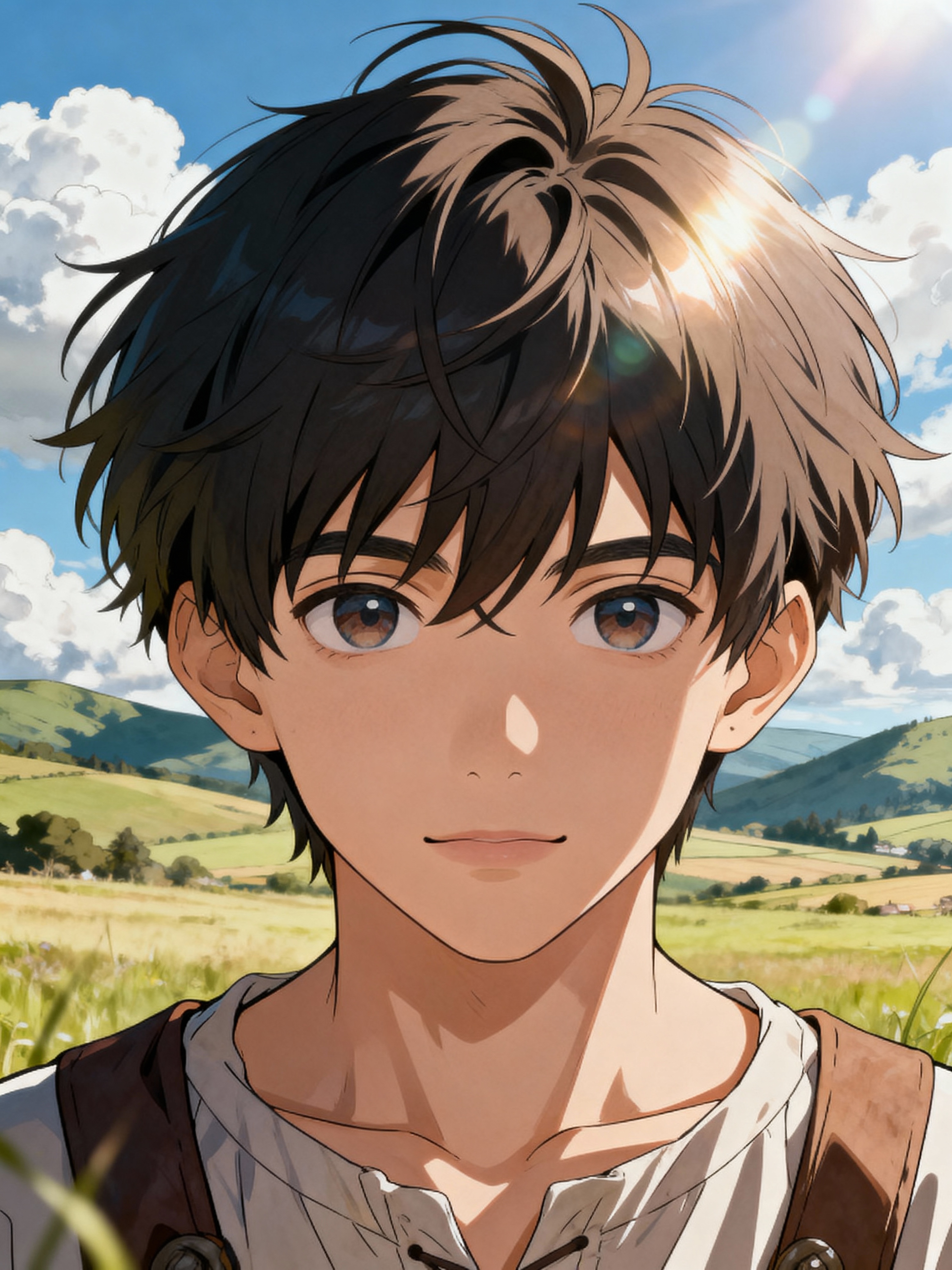A line art anime portrait of model as a young adventurer, wearing a simple but charming outfit with messy hair and kind eyes. The background shows a peaceful countryside with rolling hills and fluffy clouds. The style is soft and whimsical.