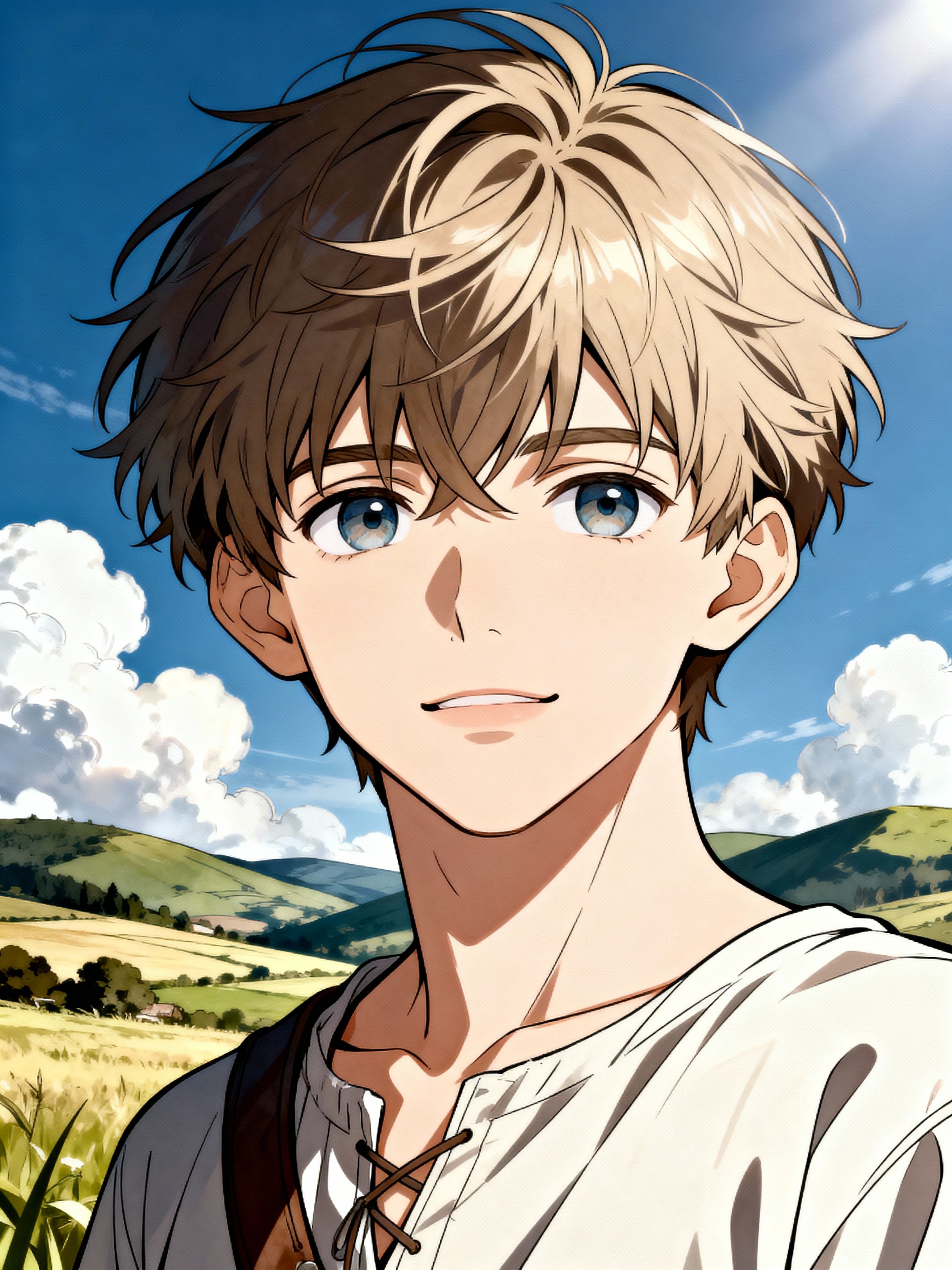 A line art anime portrait of model as a young adventurer, wearing a simple but charming outfit with messy hair and kind eyes. The background shows a peaceful countryside with rolling hills and fluffy clouds. The style is soft and whimsical.