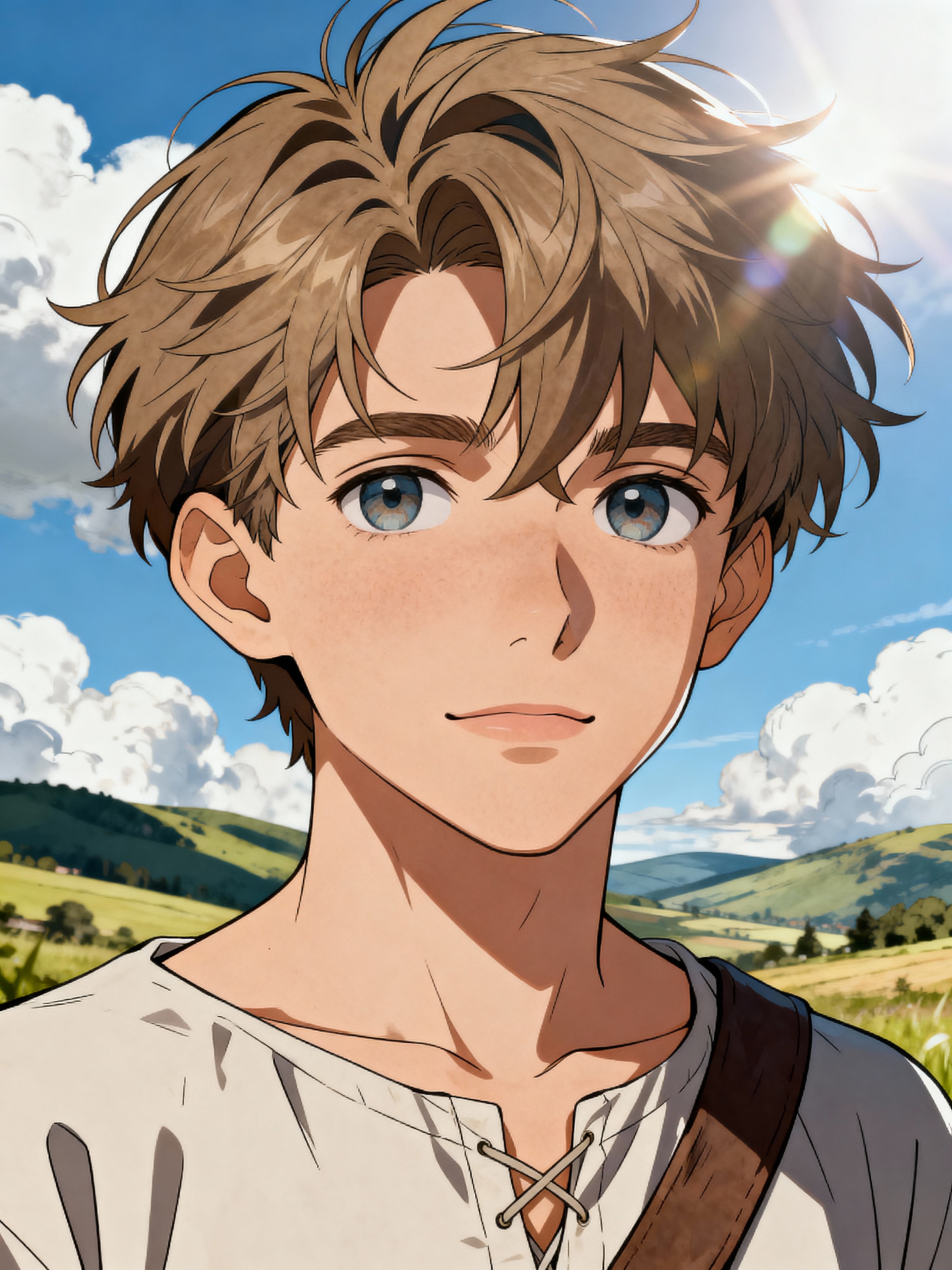 A line art anime portrait of model as a young adventurer, wearing a simple but charming outfit with messy hair and kind eyes. The background shows a peaceful countryside with rolling hills and fluffy clouds. The style is soft and whimsical.