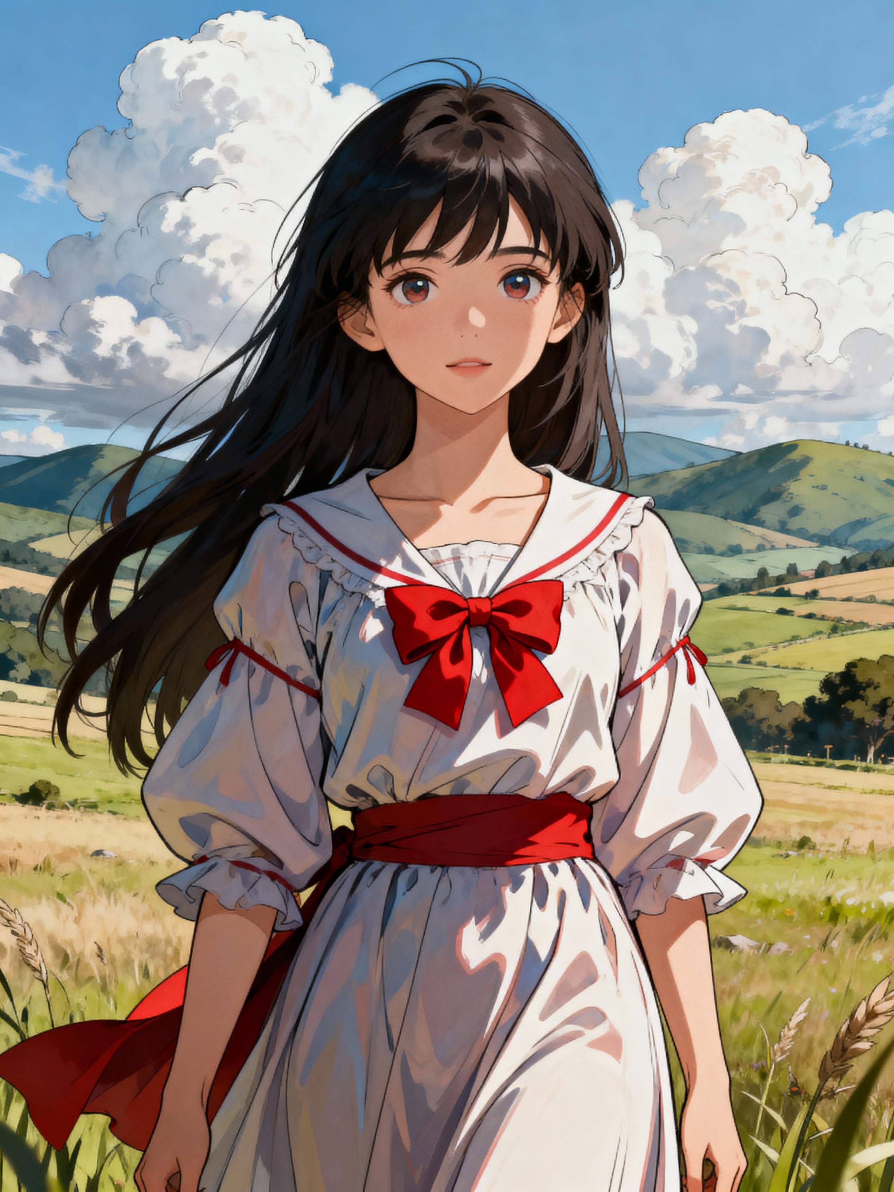 A line art anime portrait of model as a young adventurer, wearing a flowing dress with a red bow and gentle eyes . The background shows a peaceful countryside with rolling hills and fluffy clouds. The style is soft and whimsical.