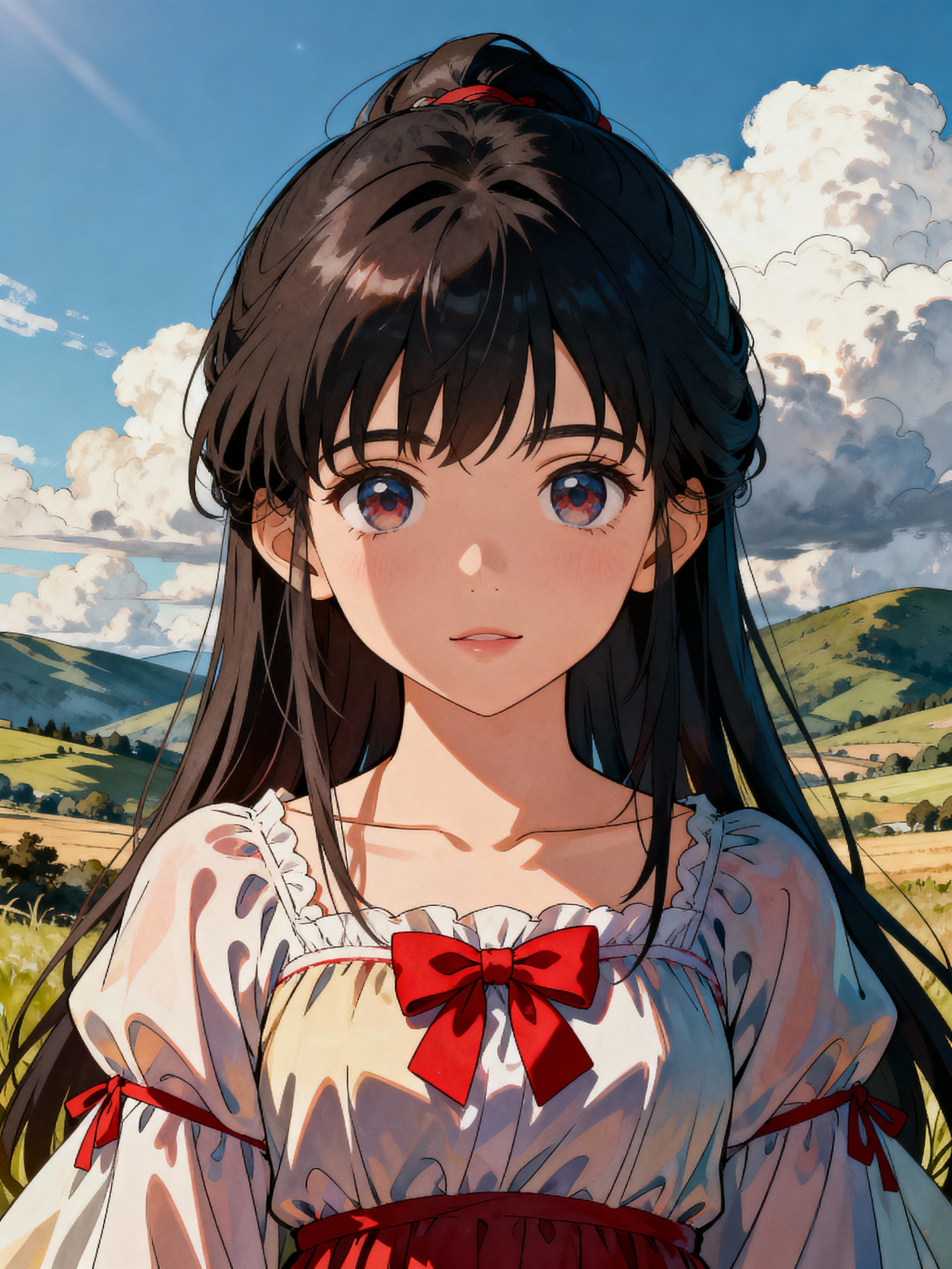 A line art anime portrait of model as a young adventurer, wearing a flowing dress with a red bow and gentle eyes . The background shows a peaceful countryside with rolling hills and fluffy clouds. The style is soft and whimsical.
