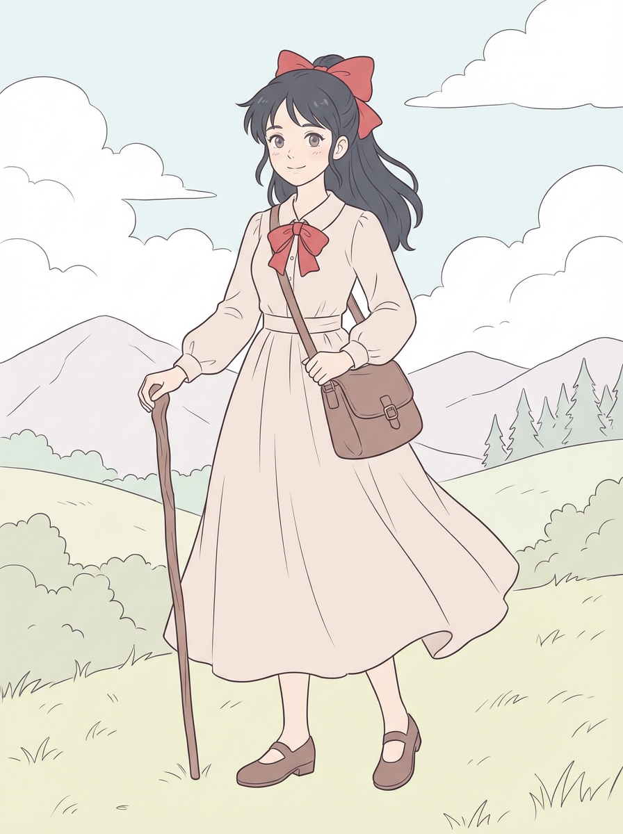 A line art anime portrait of model as a young adventurer, wearing a flowing dress with a red bow and gentle eyes . The background shows a peaceful countryside with rolling hills and fluffy clouds. The style is soft and whimsical.