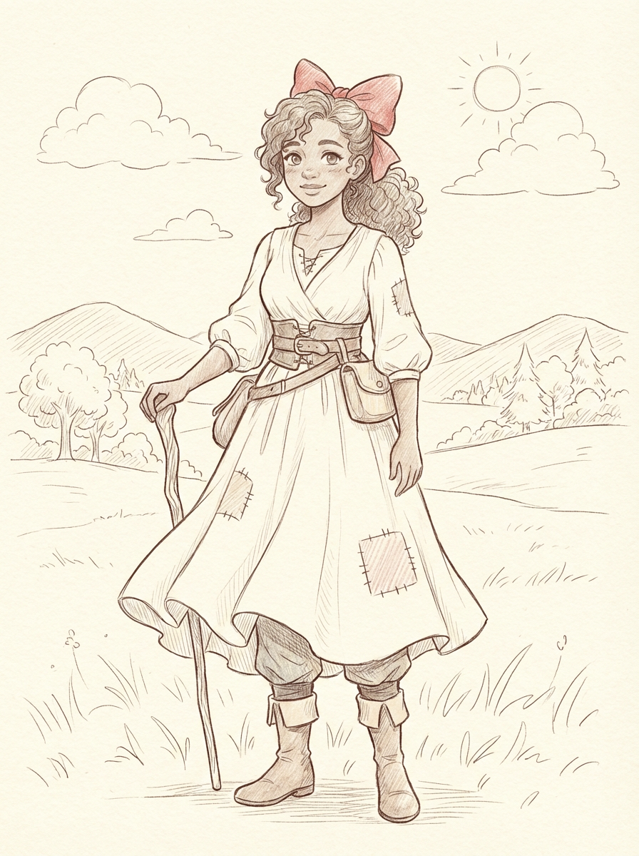 A line art anime portrait of model as a young adventurer, wearing a flowing dress with a red bow and gentle eyes . The background shows a peaceful countryside with rolling hills and fluffy clouds. The style is soft and whimsical.