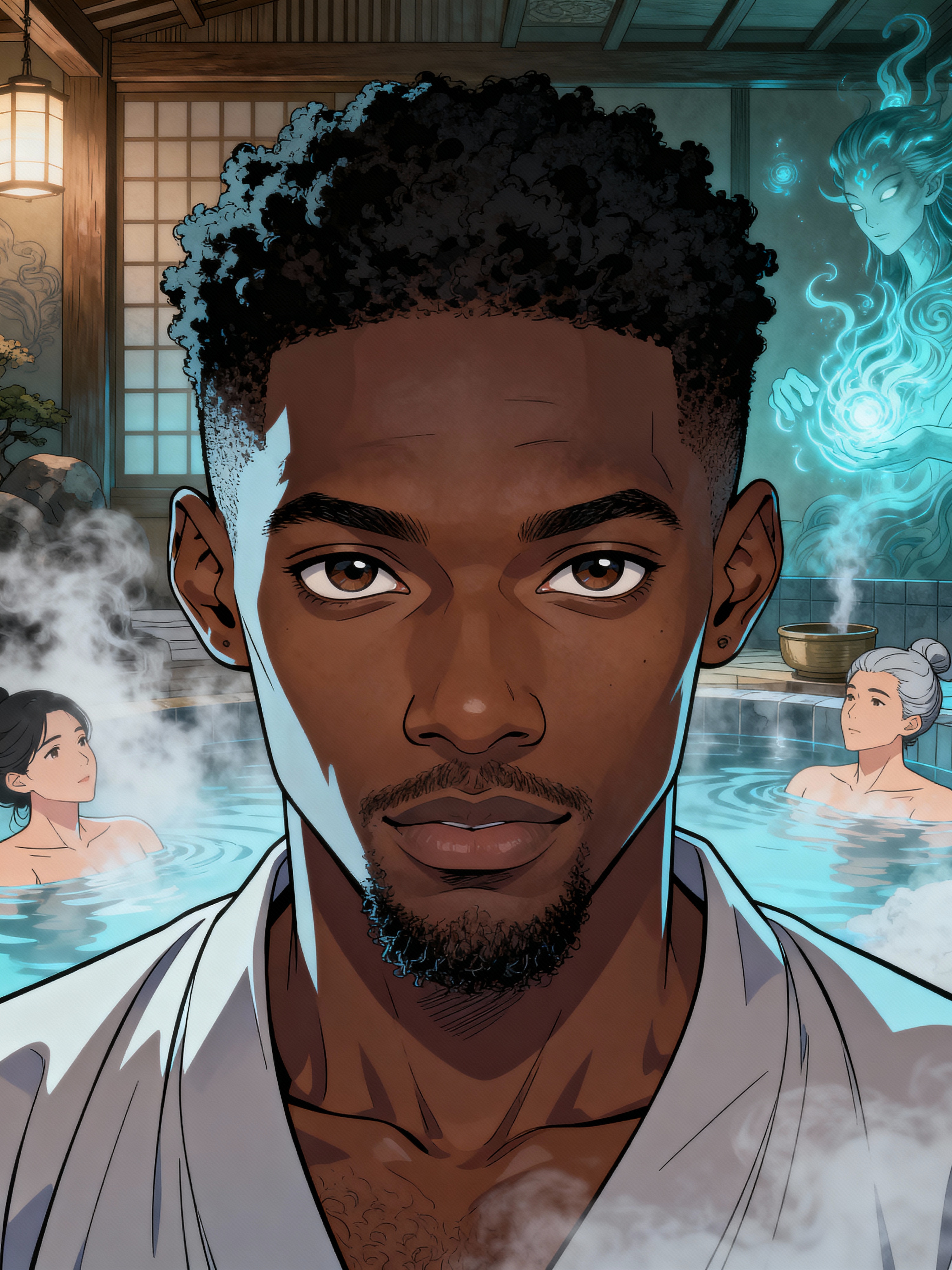 A line art anime scene at a mystical bathhouse, with model as the character wearing simple bathhouse worker clothes, helping spirit customers. Steam and magic fill the air. The style is enchanting.