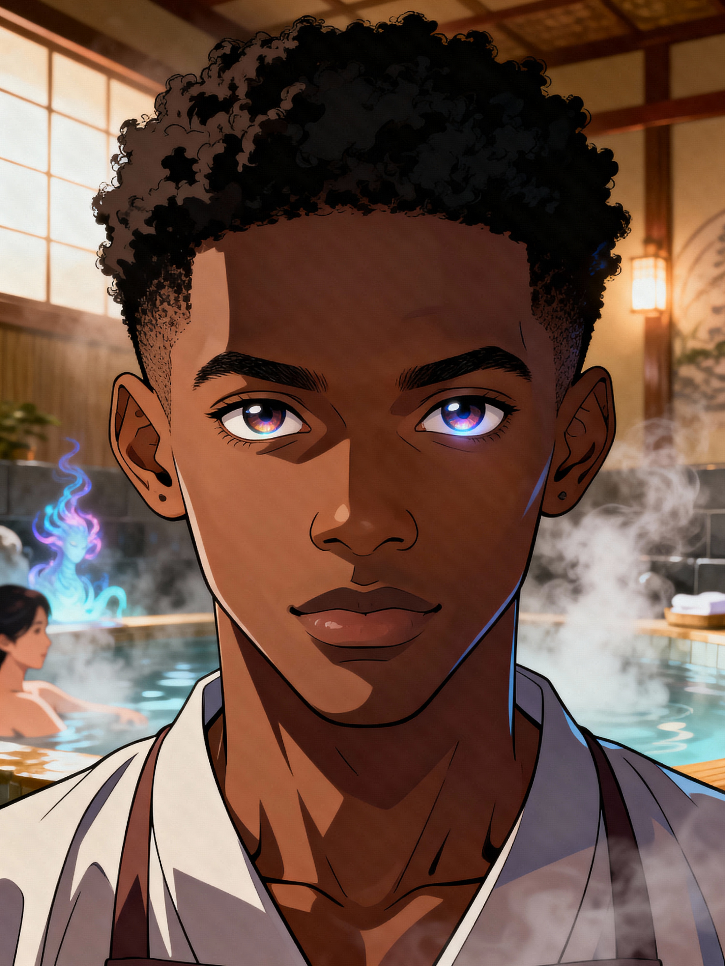 A line art anime scene at a mystical bathhouse, with model as the character wearing simple bathhouse worker clothes, helping spirit customers. Steam and magic fill the air. The style is enchanting.