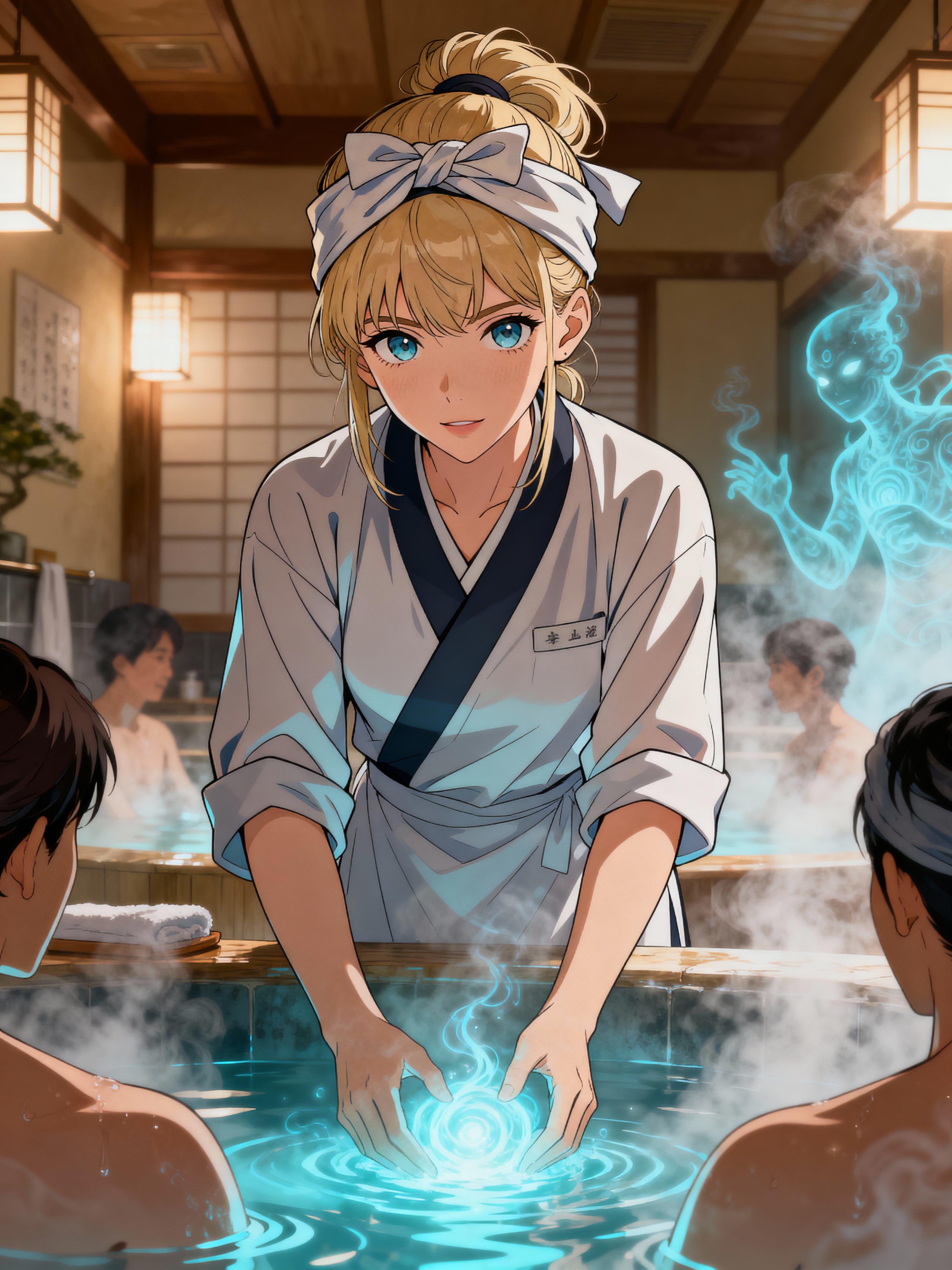 A line art anime scene at a mystical bathhouse, with model as the character wearing a traditional worker's uniform with a cloth headband , helping spirit customers. Steam and magic fill the air. The style is enchanting.