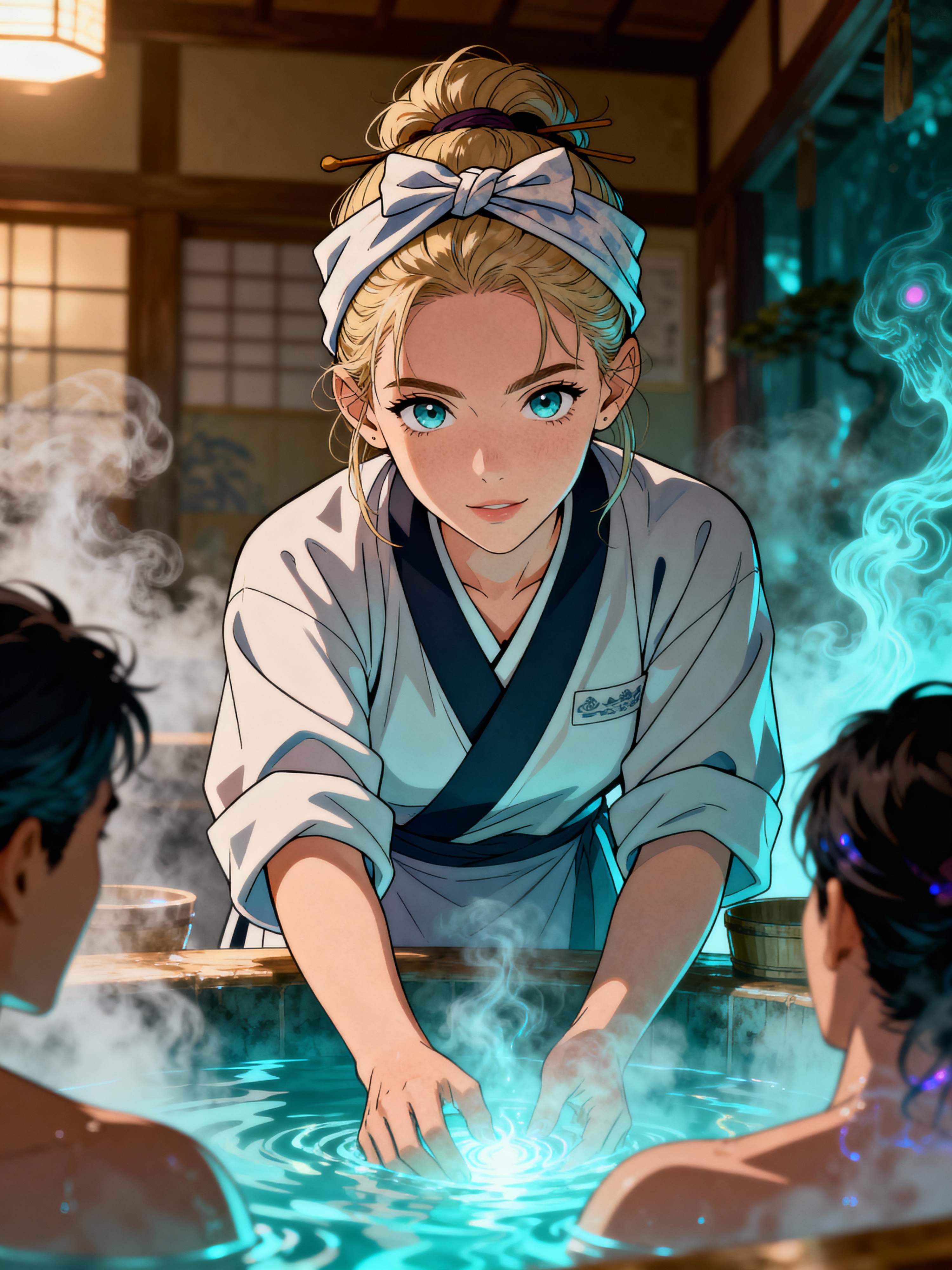 A line art anime scene at a mystical bathhouse, with model as the character wearing a traditional worker's uniform with a cloth headband , helping spirit customers. Steam and magic fill the air. The style is enchanting.