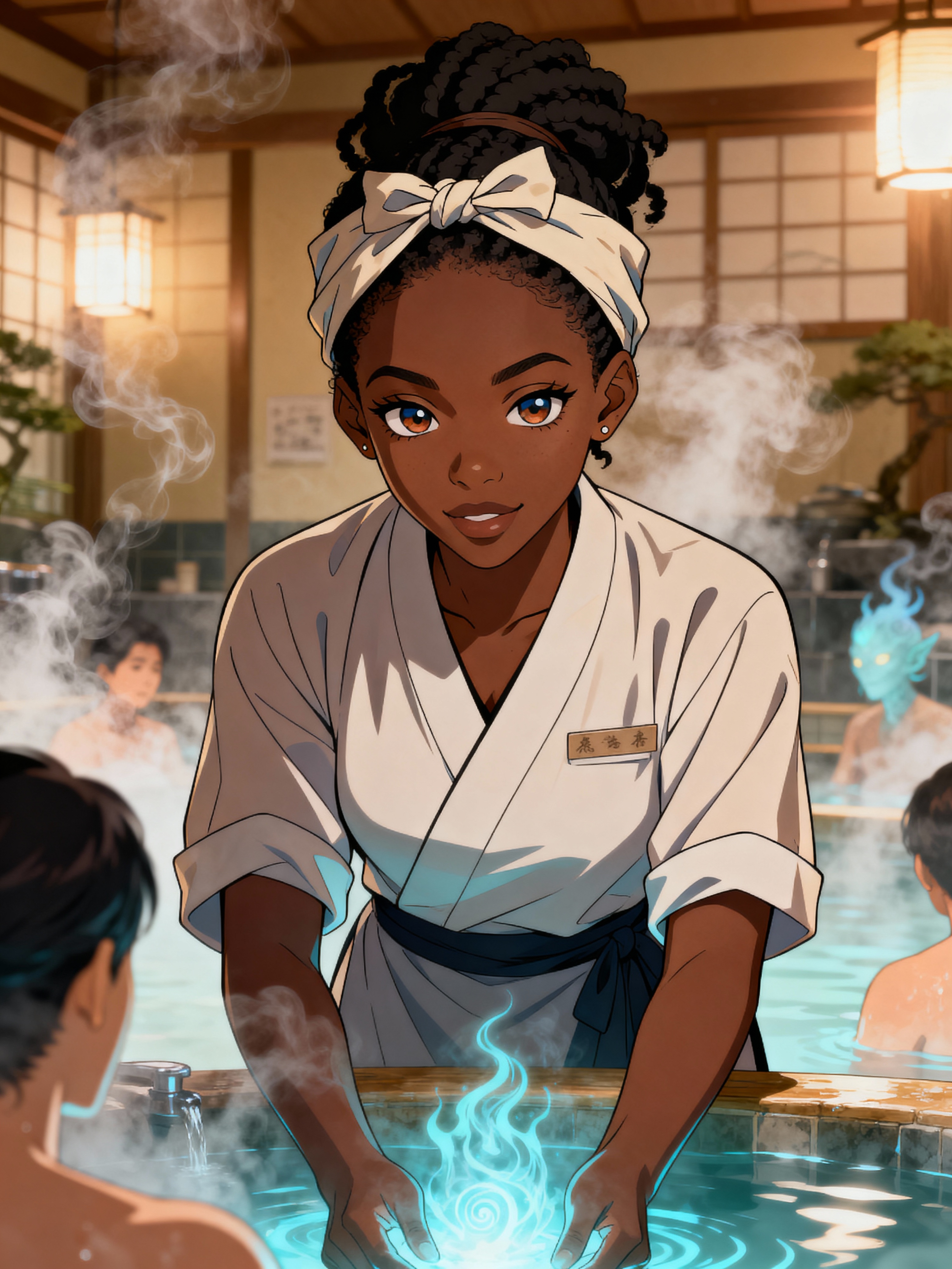 A line art anime scene at a mystical bathhouse, with model as the character wearing a traditional worker's uniform with a cloth headband , helping spirit customers. Steam and magic fill the air. The style is enchanting.