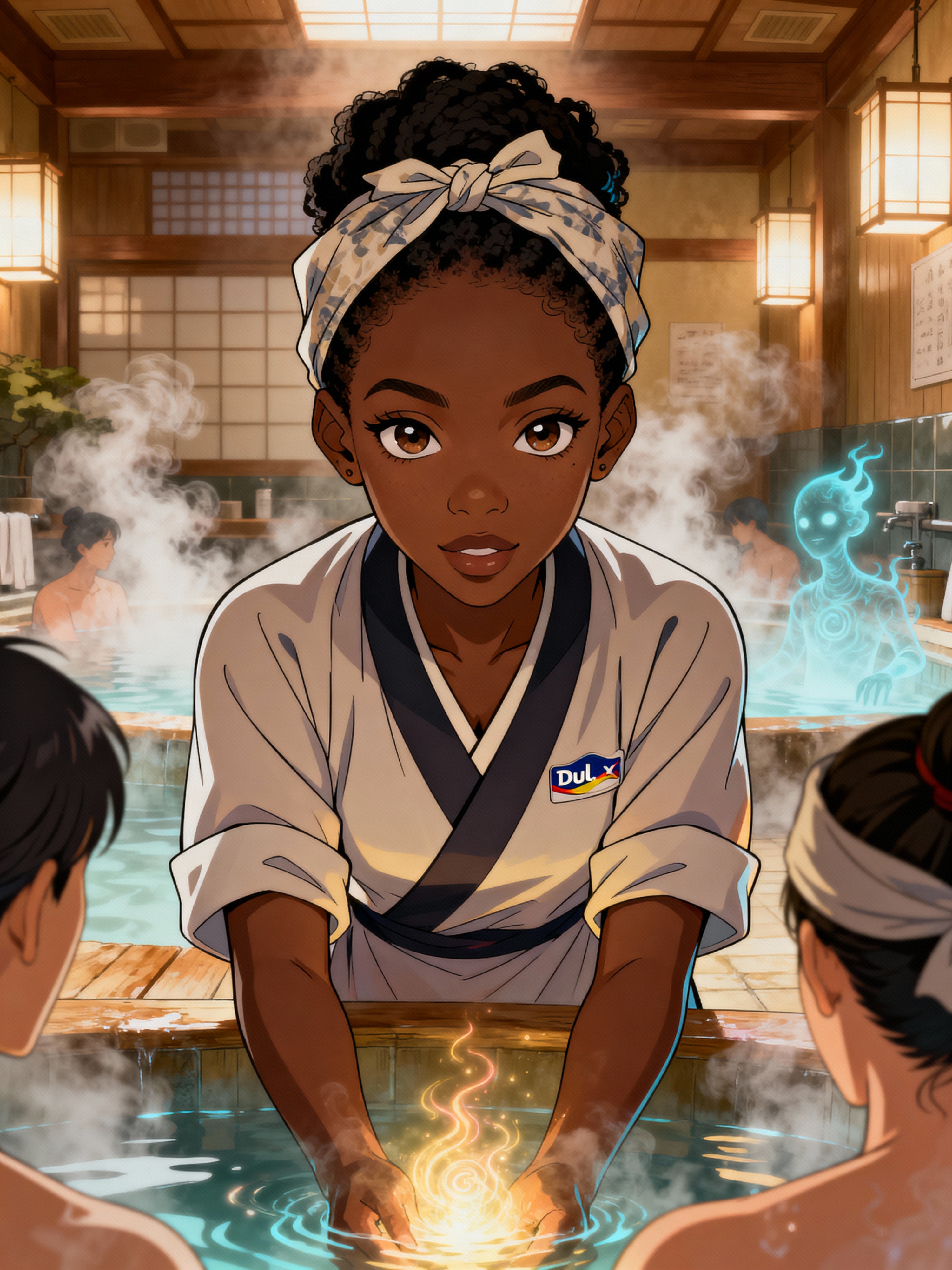 A line art anime scene at a mystical bathhouse, with model as the character wearing a traditional worker's uniform with a cloth headband , helping spirit customers. Steam and magic fill the air. The style is enchanting.
