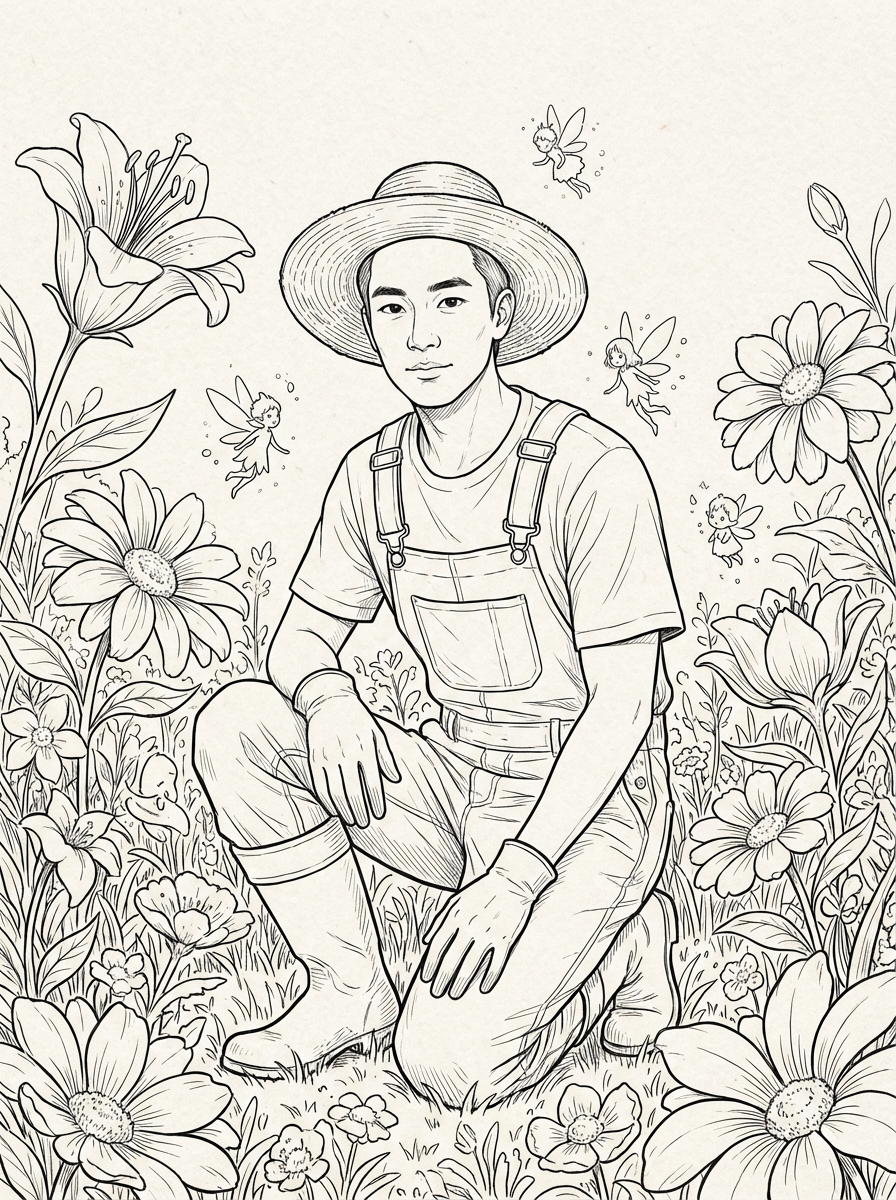 A line art anime scene in a magical garden, with model as the character wearing light gardening clothes with a sunhat, surrounded by giant flowers and tiny garden spirits. The garden feels alive with magic. The style is peaceful.