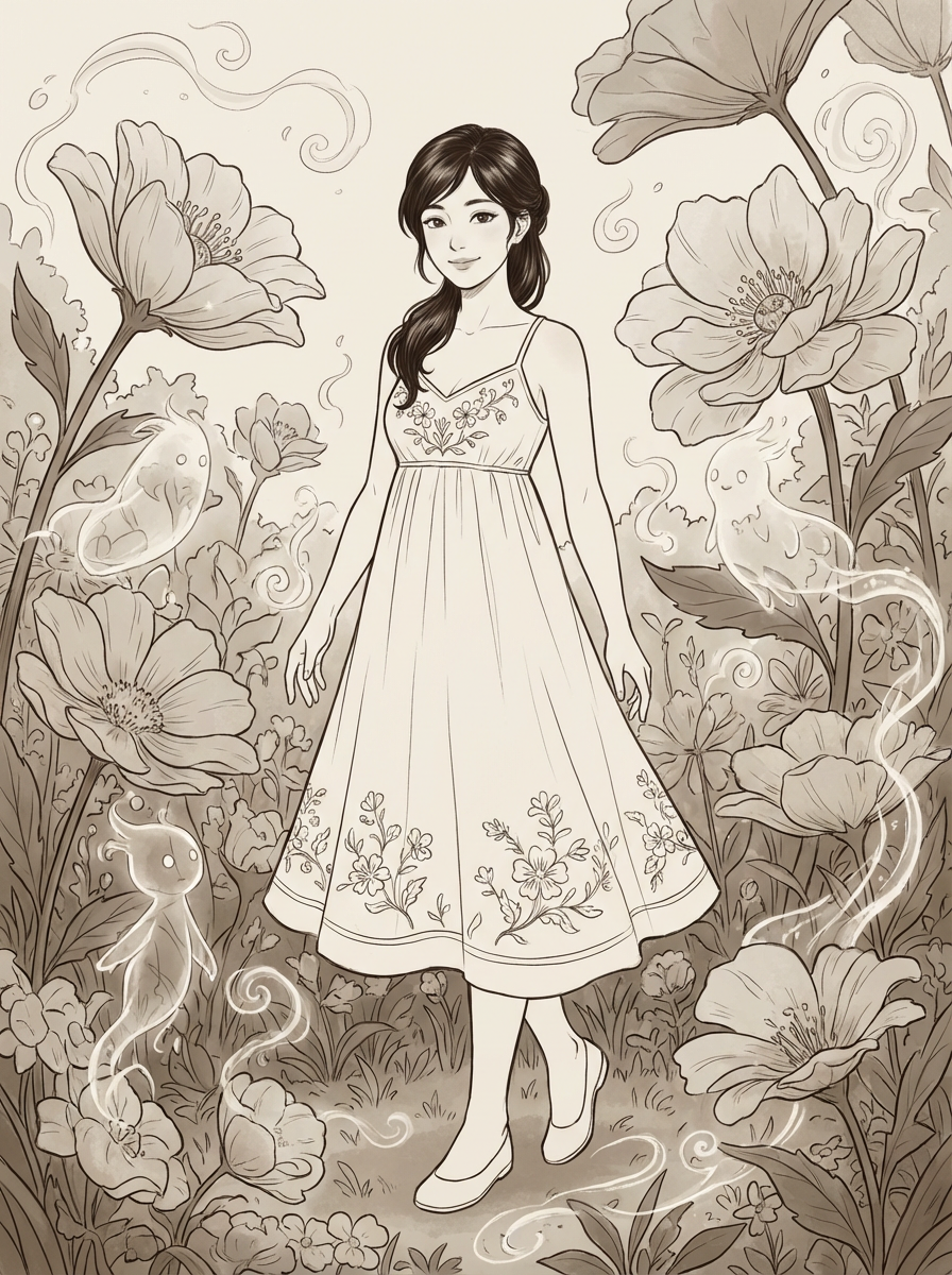 A line art anime scene in a magical garden, with model as the character wearing a simple sundress with flower decorations , surrounded by giant flowers and tiny garden spirits. The garden feels alive with magic. The style is peaceful.