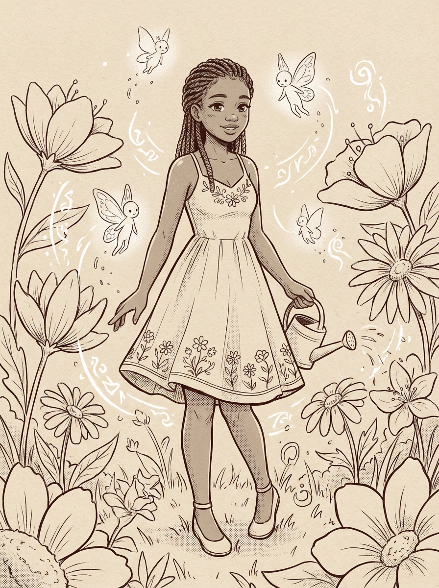 A line art anime scene in a magical garden, with model as the character wearing a simple sundress with flower decorations , surrounded by giant flowers and tiny garden spirits. The garden feels alive with magic. The style is peaceful.