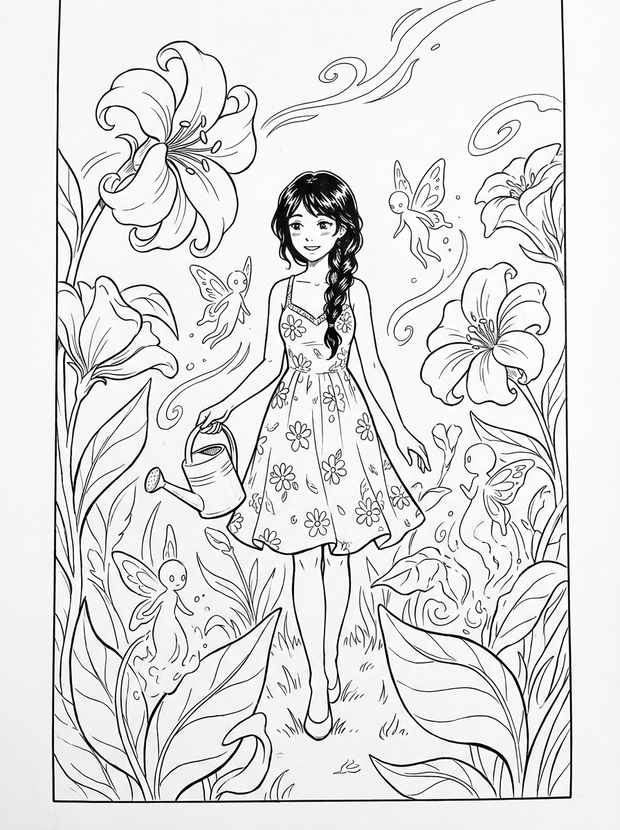 A line art anime scene in a magical garden, with model as the character wearing a simple sundress with flower decorations , surrounded by giant flowers and tiny garden spirits. The garden feels alive with magic. The style is peaceful.