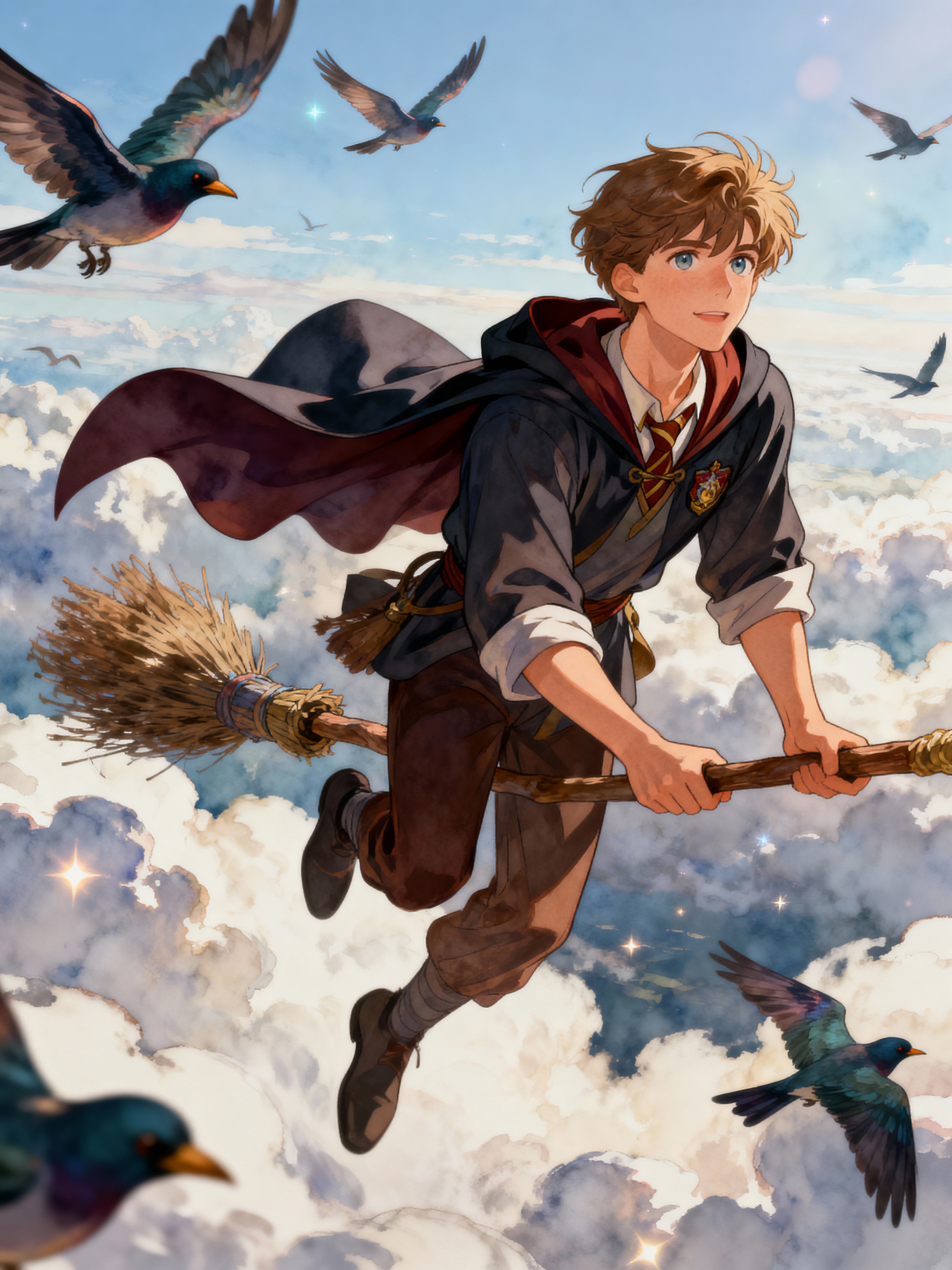 A line art anime scene of model as a character flying through clouds on a magical broomstick, wearing an apprentice wizard outfit with a cape, surrounded by friendly birds. The sky is painted in soft watercolors. The style is magical.