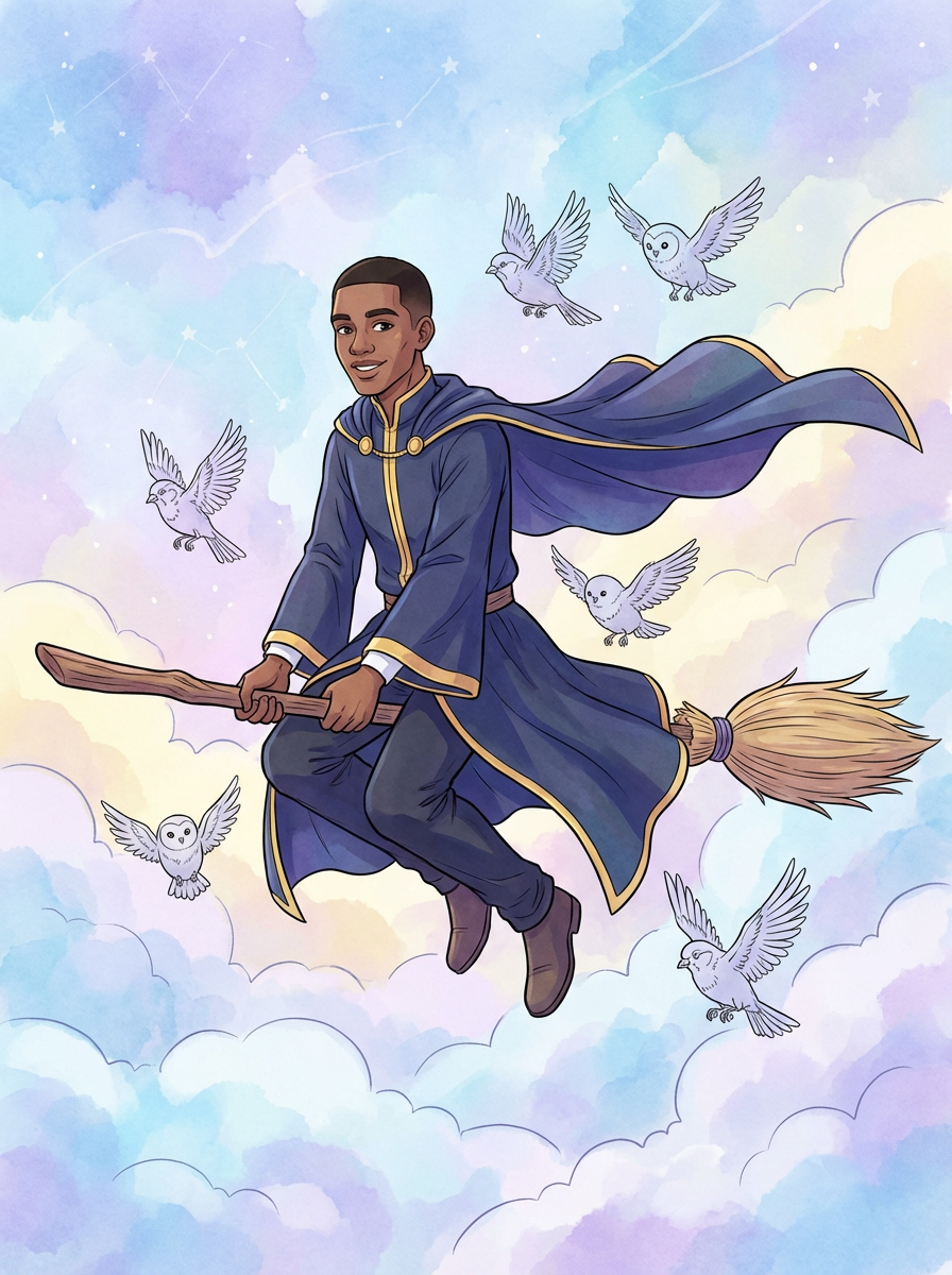 A line art anime scene of model as a character flying through clouds on a magical broomstick, wearing an apprentice wizard outfit with a cape, surrounded by friendly birds. The sky is painted in soft watercolors. The style is magical.