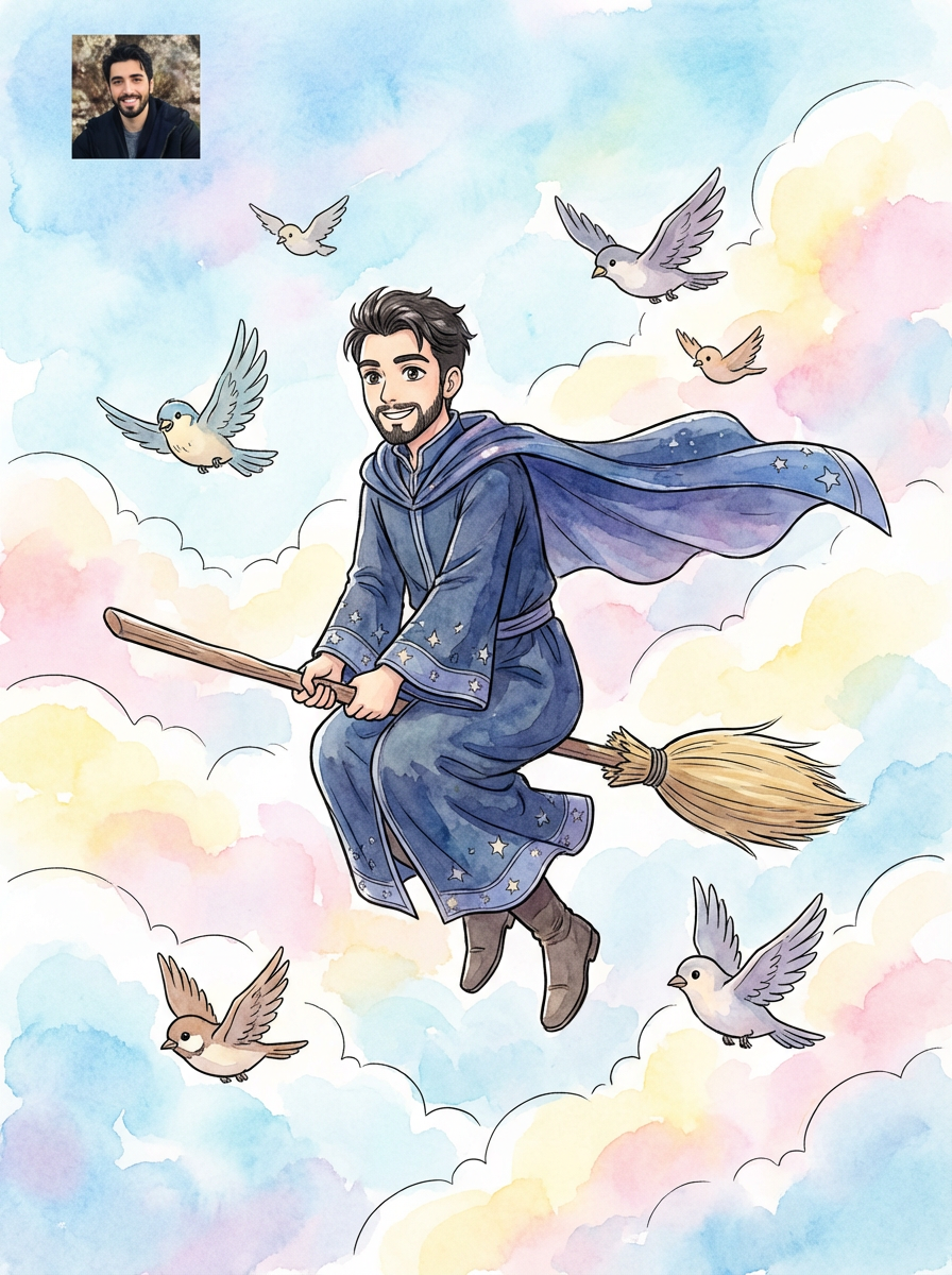 A line art anime scene of model as a character flying through clouds on a magical broomstick, wearing an apprentice wizard outfit with a cape, surrounded by friendly birds. The sky is painted in soft watercolors. The style is magical.
