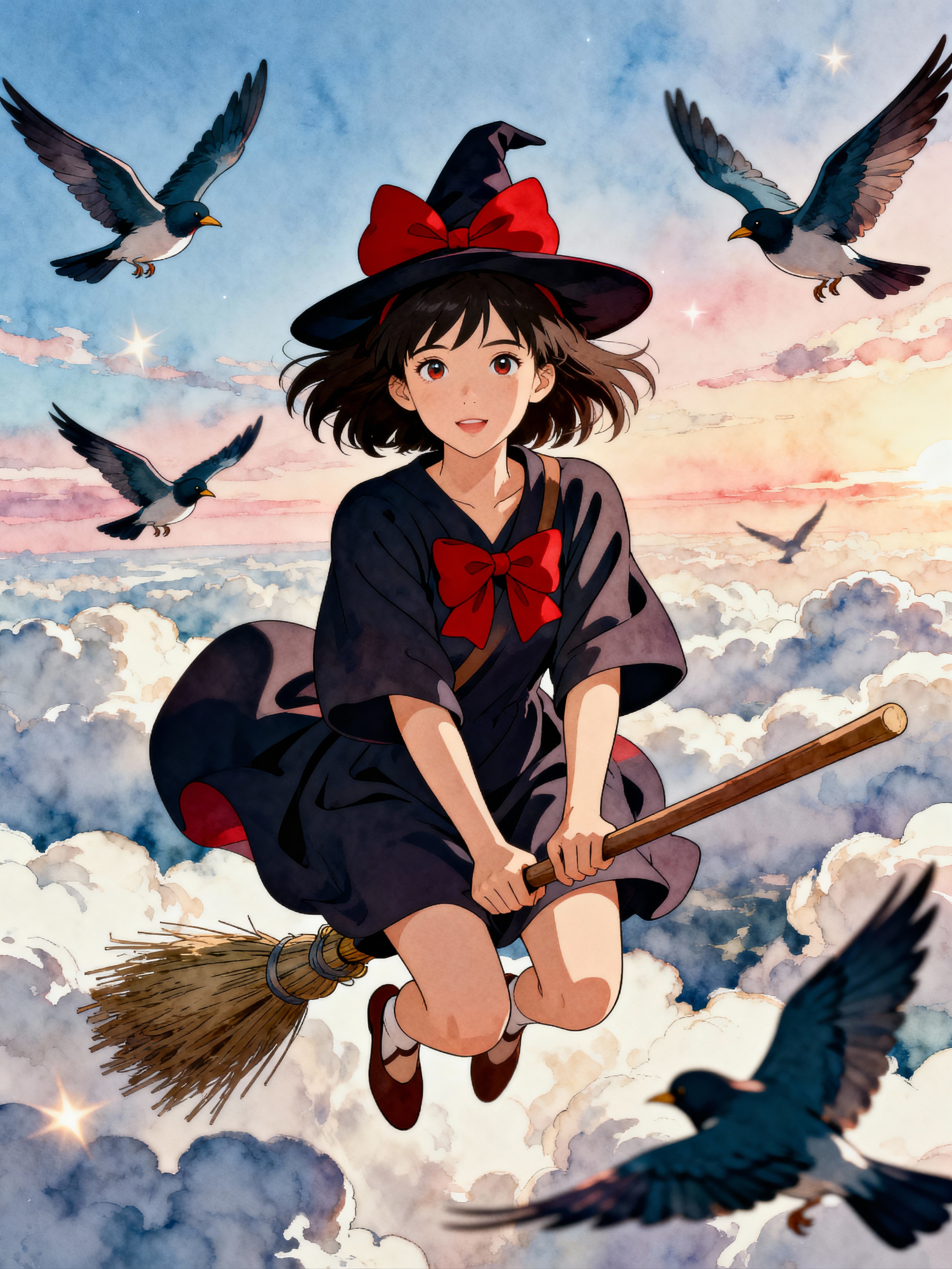 A line art anime scene of model as a character flying through clouds on a magical broomstick, wearing a witch apprentice dress with a red bow , surrounded by friendly birds. The sky is painted in soft watercolors. The style is magical.