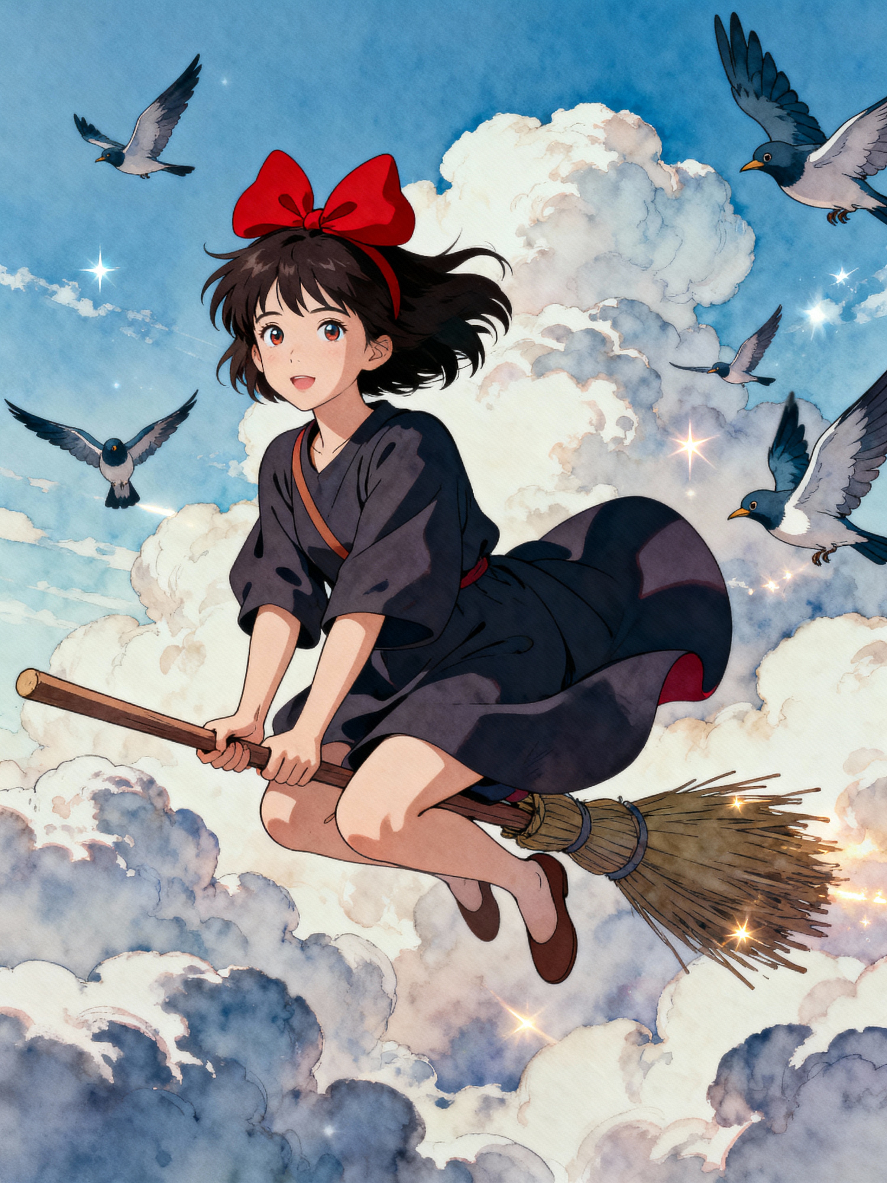 A line art anime scene of model as a character flying through clouds on a magical broomstick, wearing a witch apprentice dress with a red bow , surrounded by friendly birds. The sky is painted in soft watercolors. The style is magical.